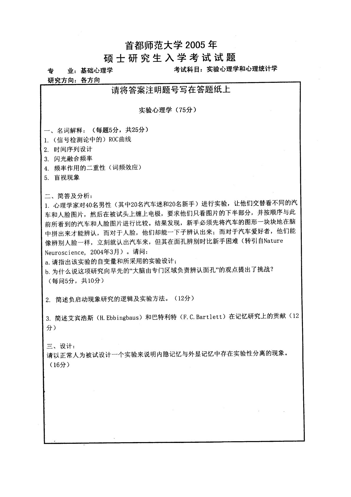 首都师范大学347心理学专业综合2005年真题(实验心理学和心理统计学)