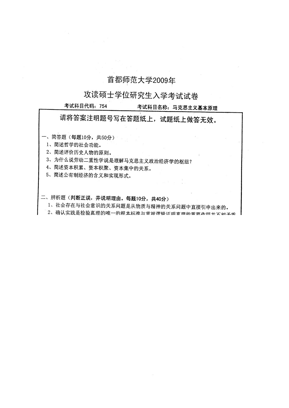 首都师范大学754马克思主义基本原理2009年真题
