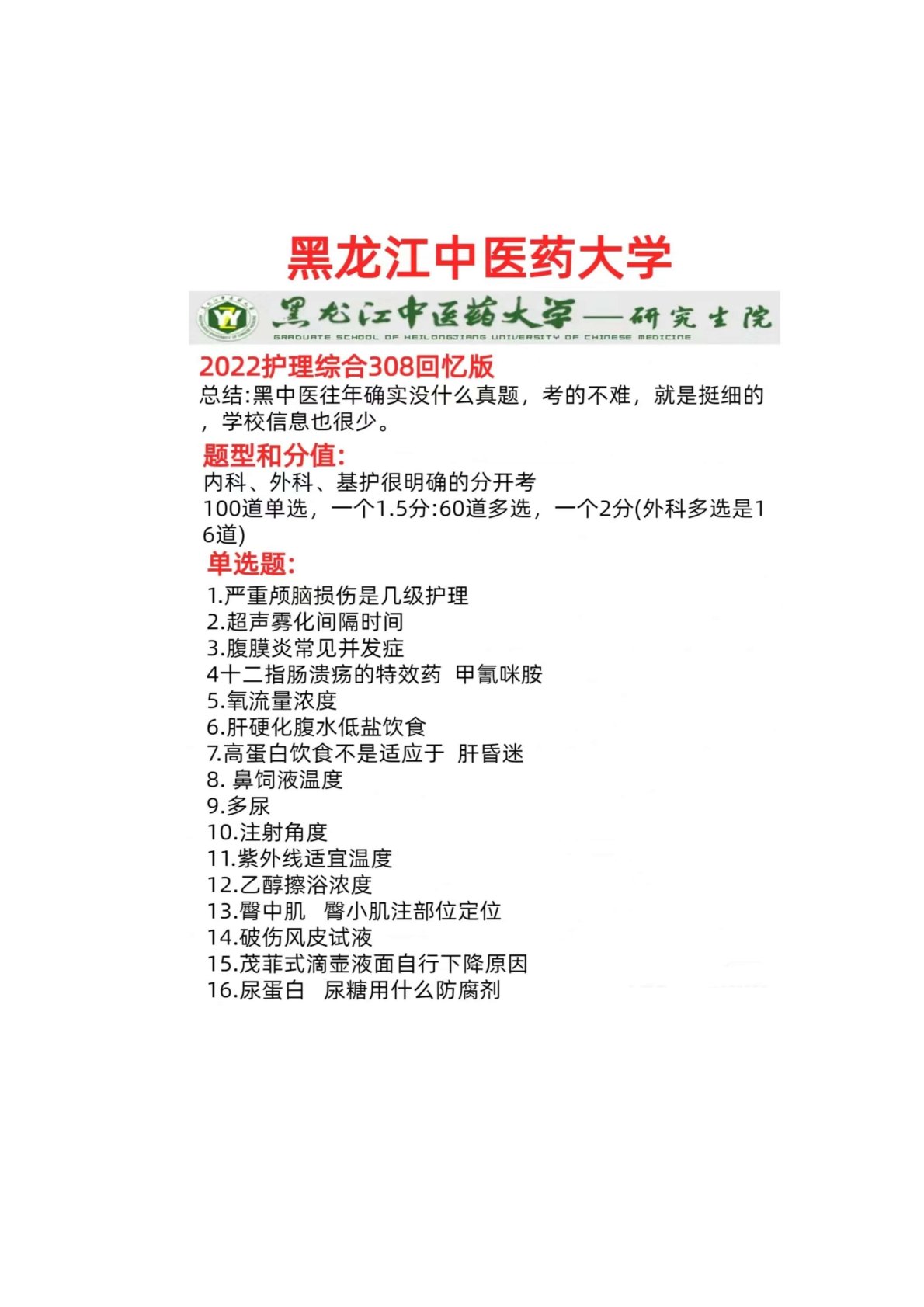 黑龙江中医药大学308护理综合2022年真题回忆版