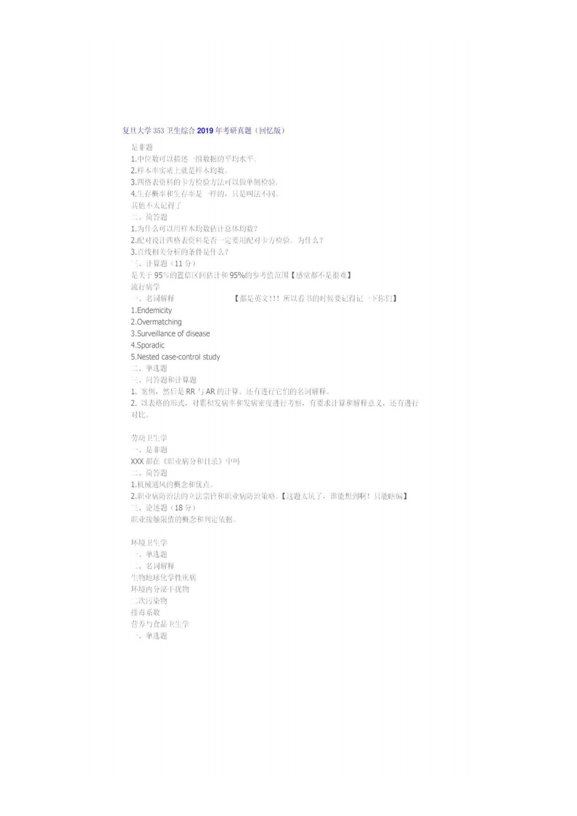 复旦大学761卫生综合2019年真题回忆