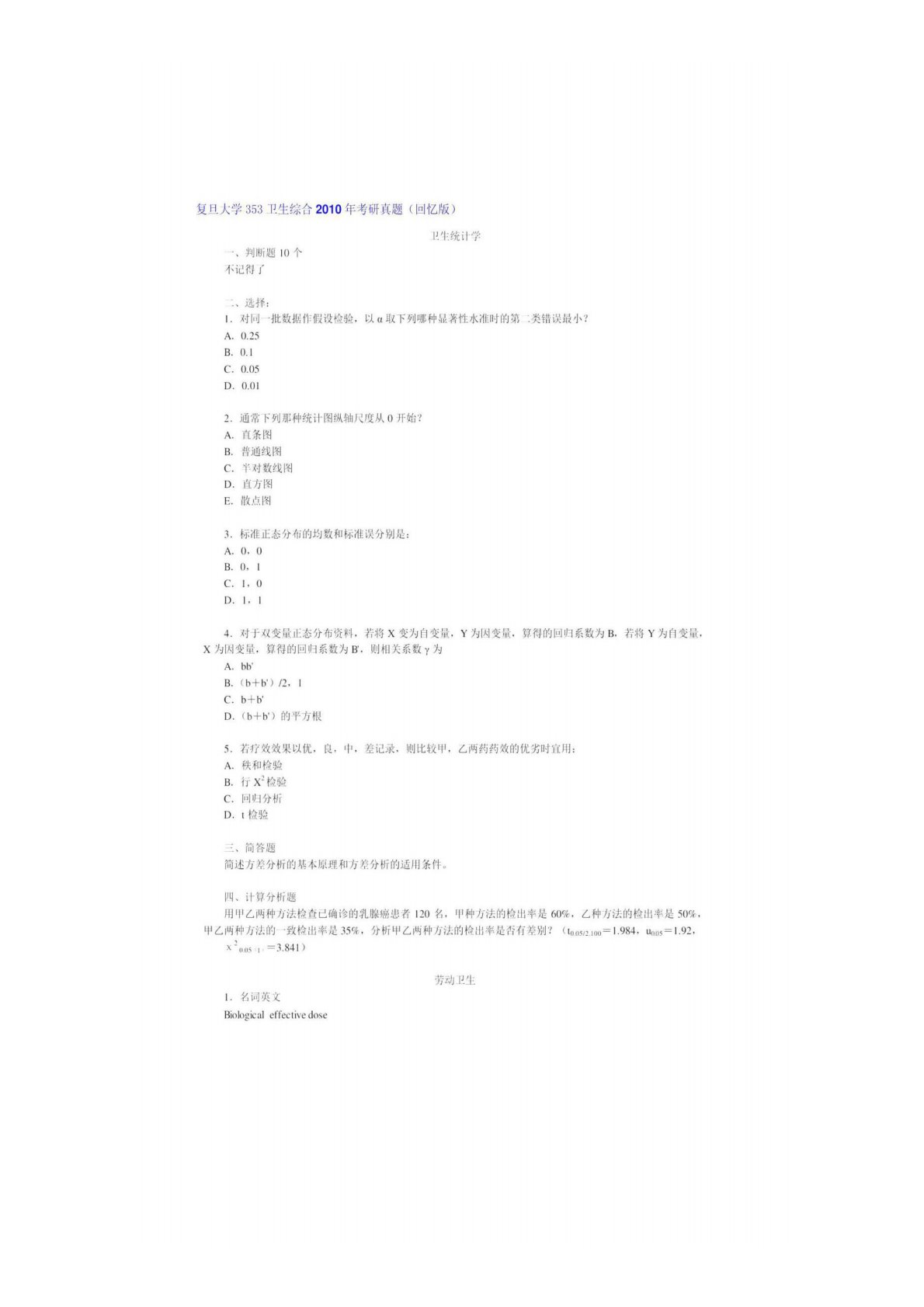 复旦大学761卫生综合2010年真题回忆
