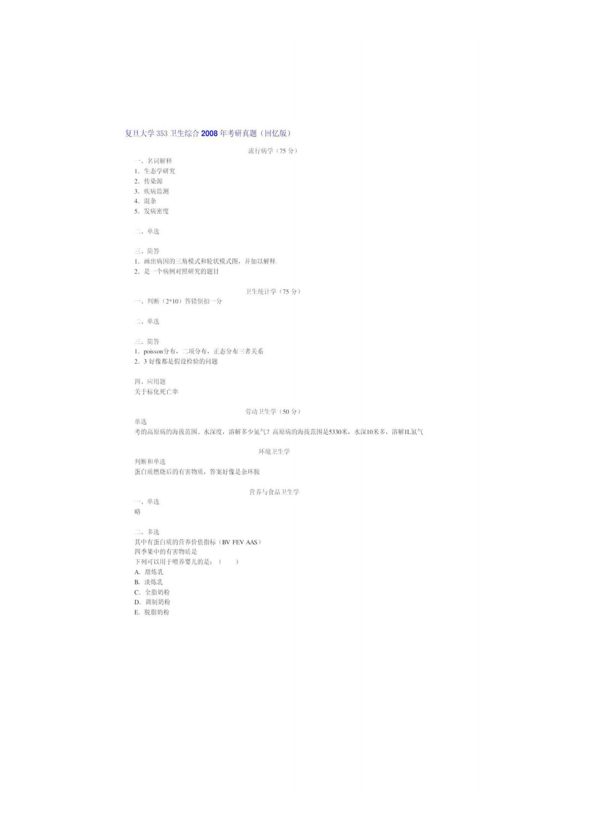 复旦大学761卫生综合2008年真题回忆