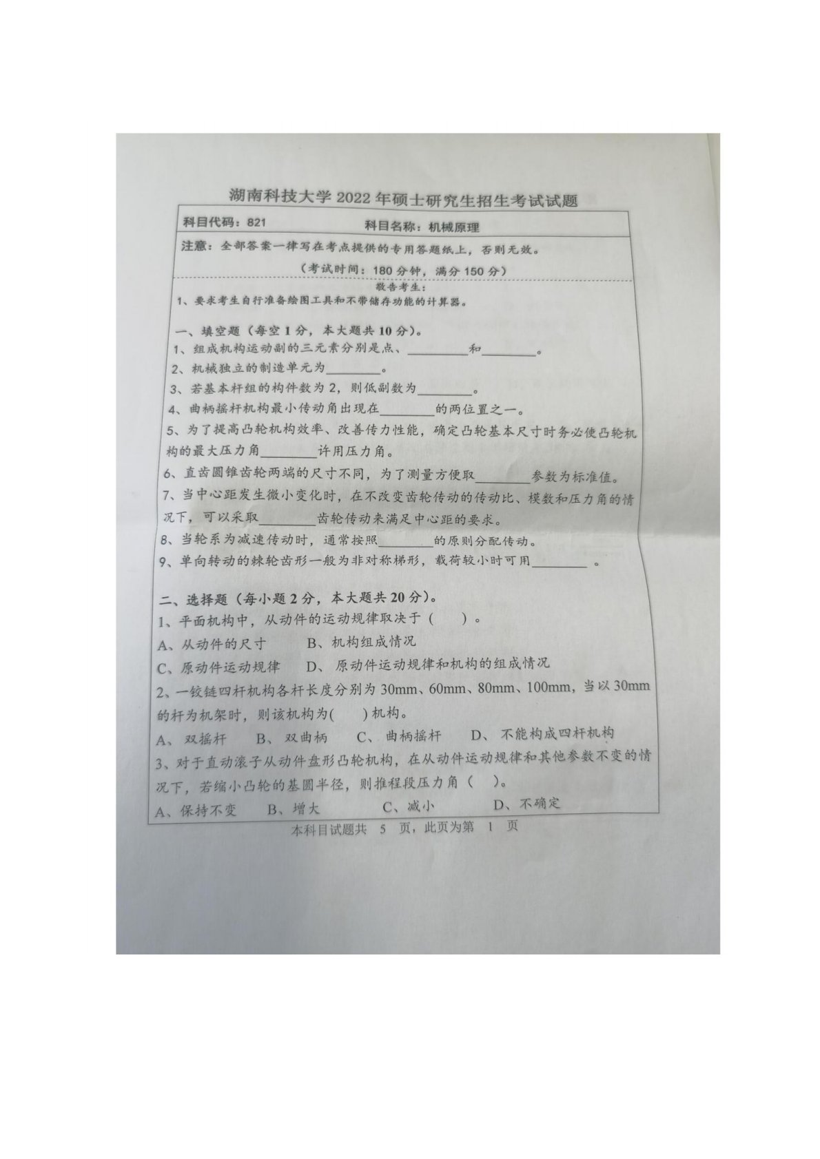 湖南科技大学821机械原理2022年真题
