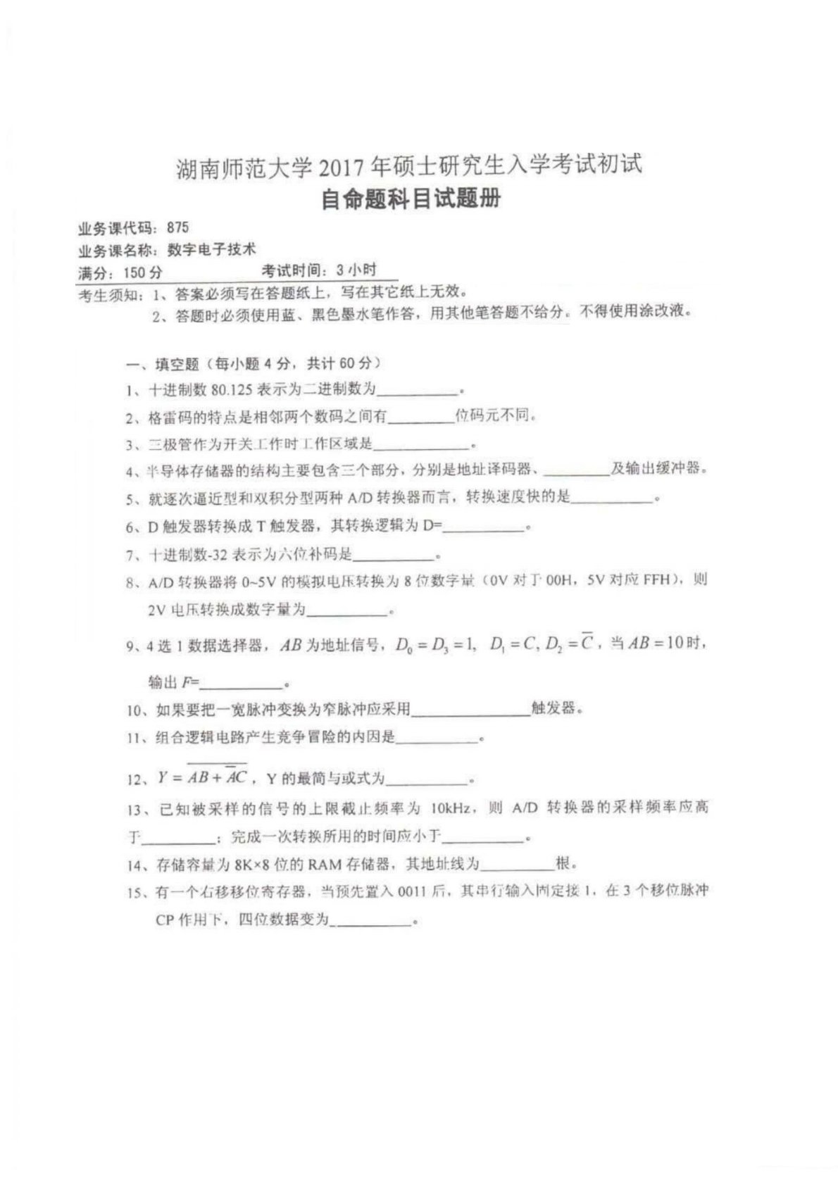 湖南师范大学2017年875数字电子技术考研真题