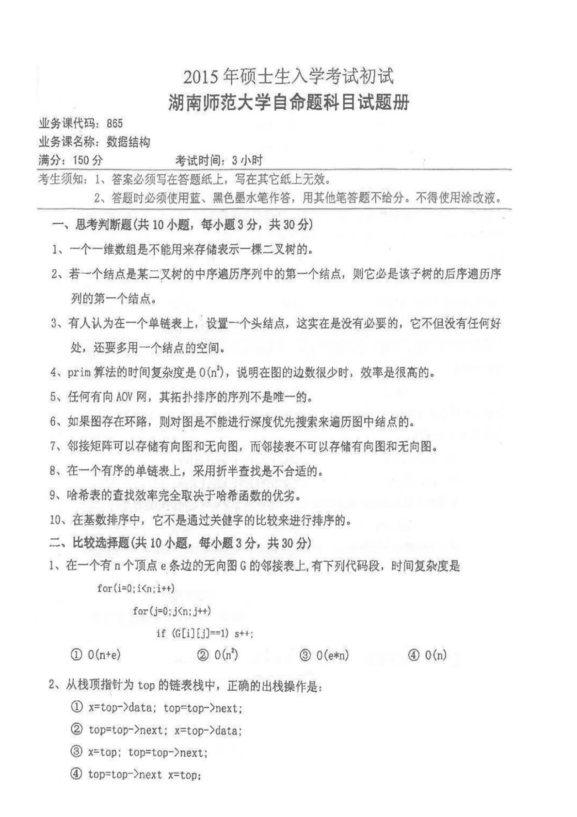 湖南师范大学865数据结构2015年真题