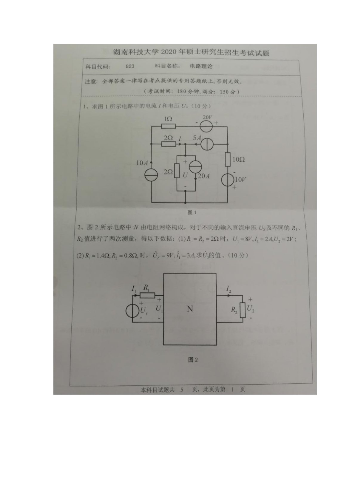 湖南科技大学2020年823电路考研真题