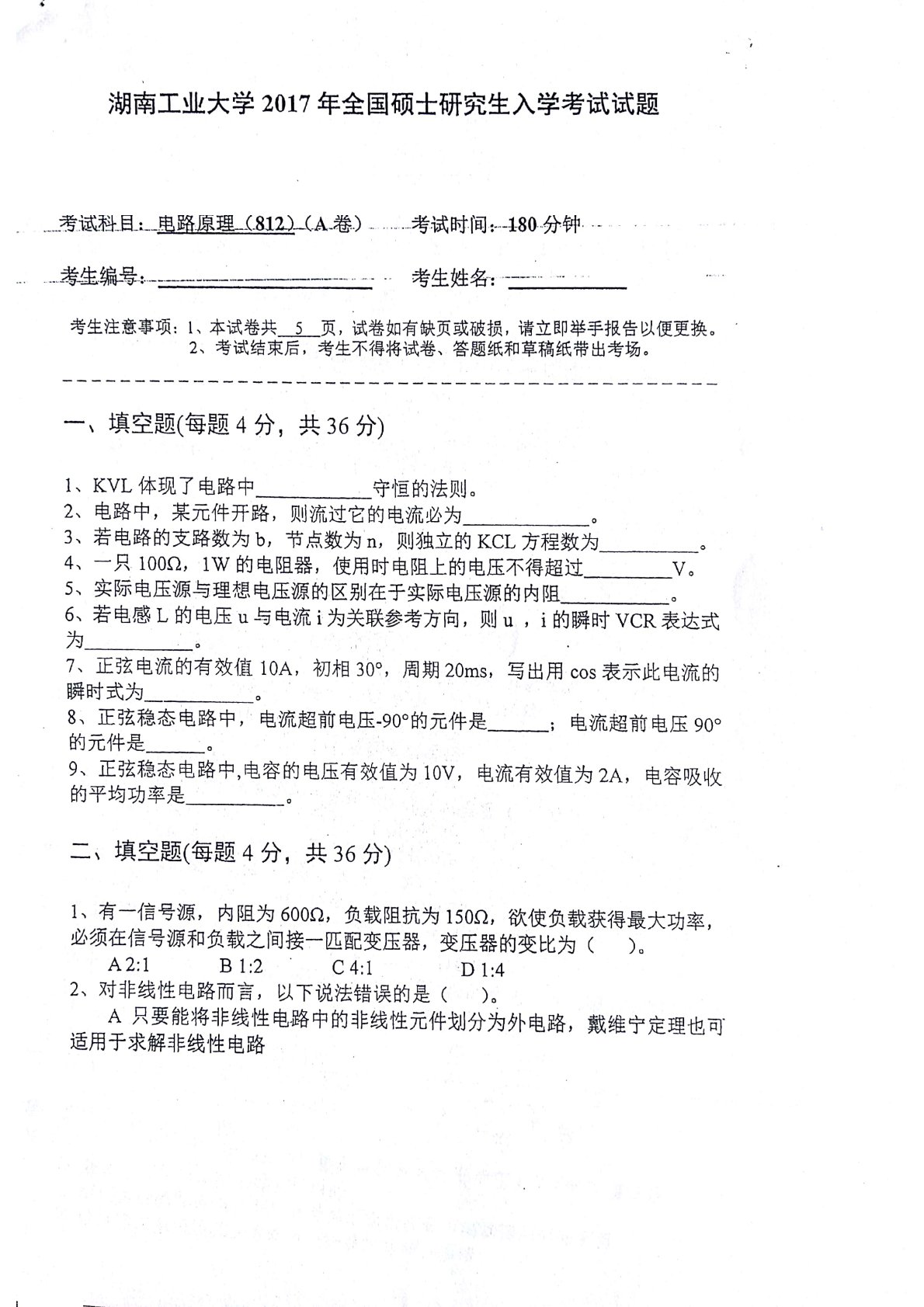 湖南工业大学2017年812电路原理考研真题