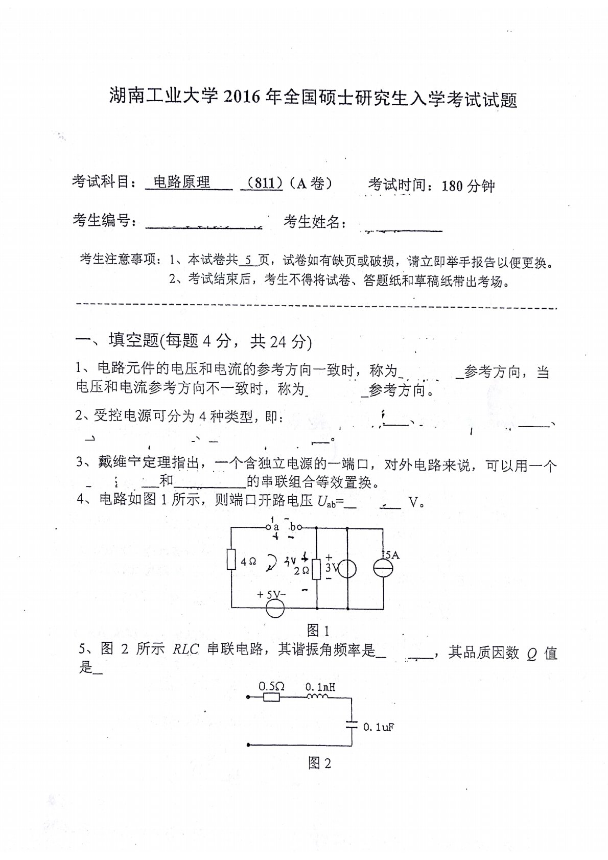 湖南工业大学2016年812电路原理考研真题
