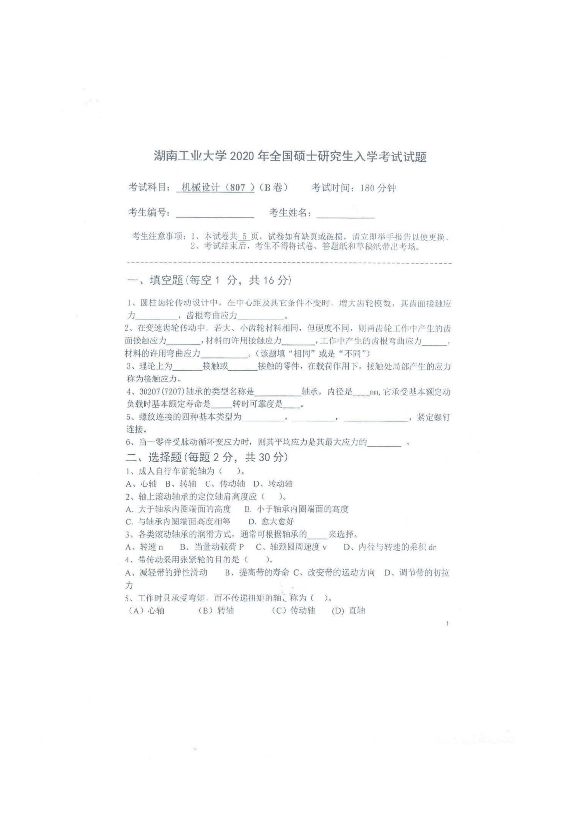 湖南工业大学807机械设计2020年真题B卷