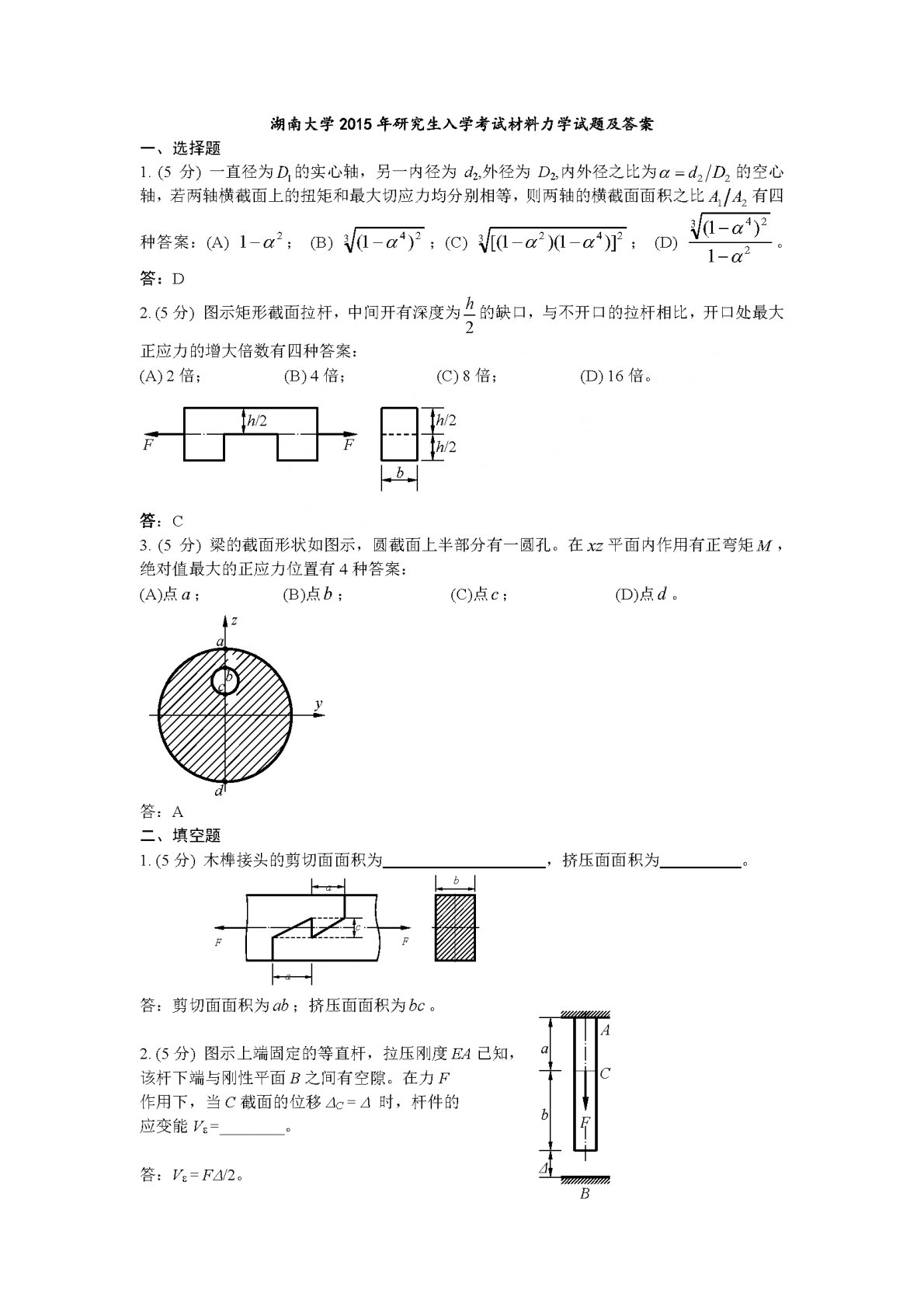 湖南大学2015年812《材料力学》考研真题
