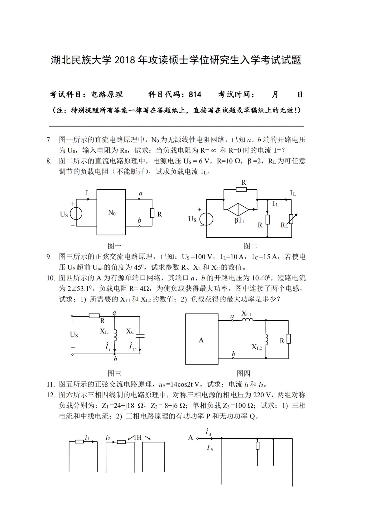 湖北民族大学814电路2018年考研真题