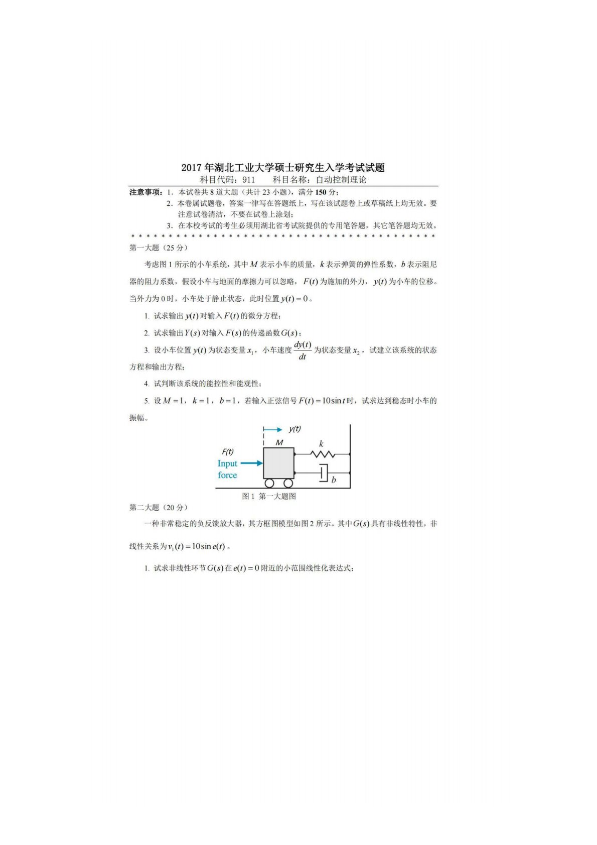 湖北工业大学911自动控制理论2017年真题