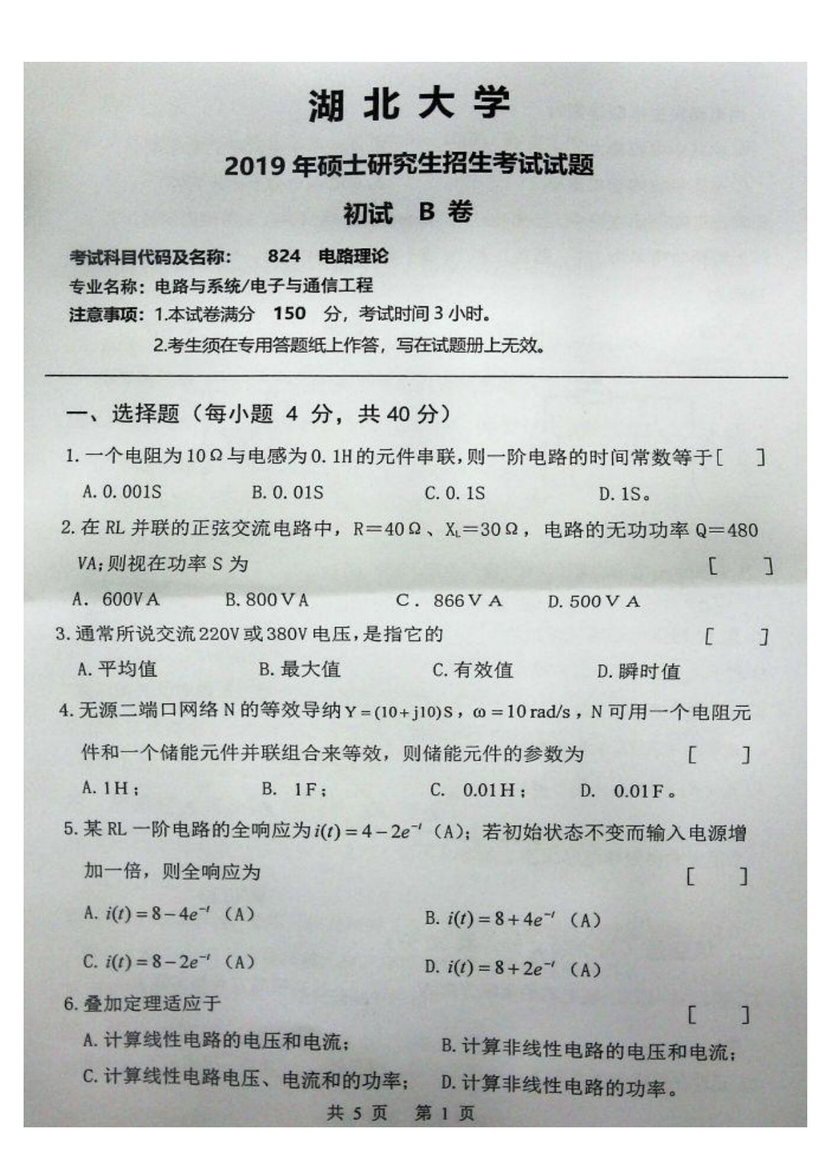 湖北大学2019年824电路理论考研真题