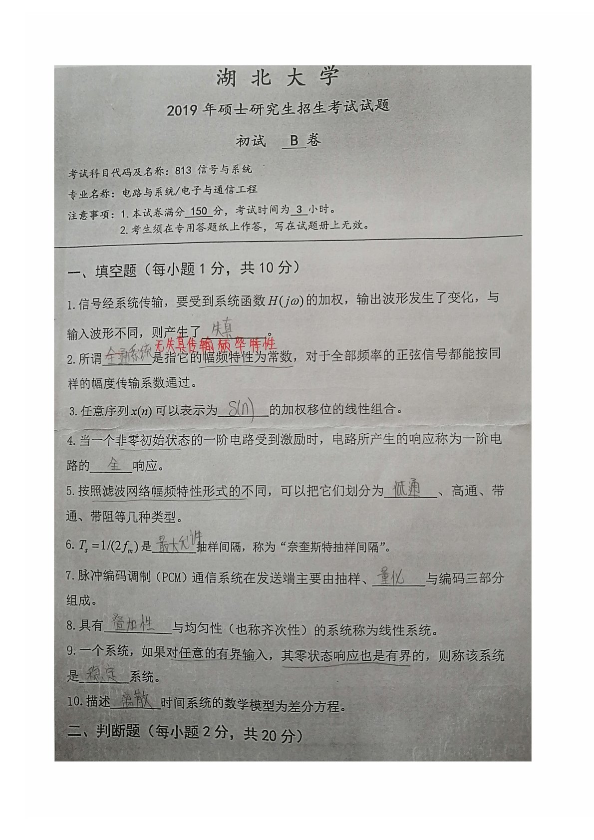 湖北大学813信号与系统2019年真题答案