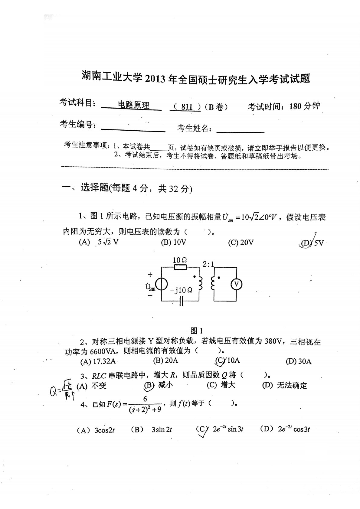 湖南工业大学2013年812电路原理考研真题
