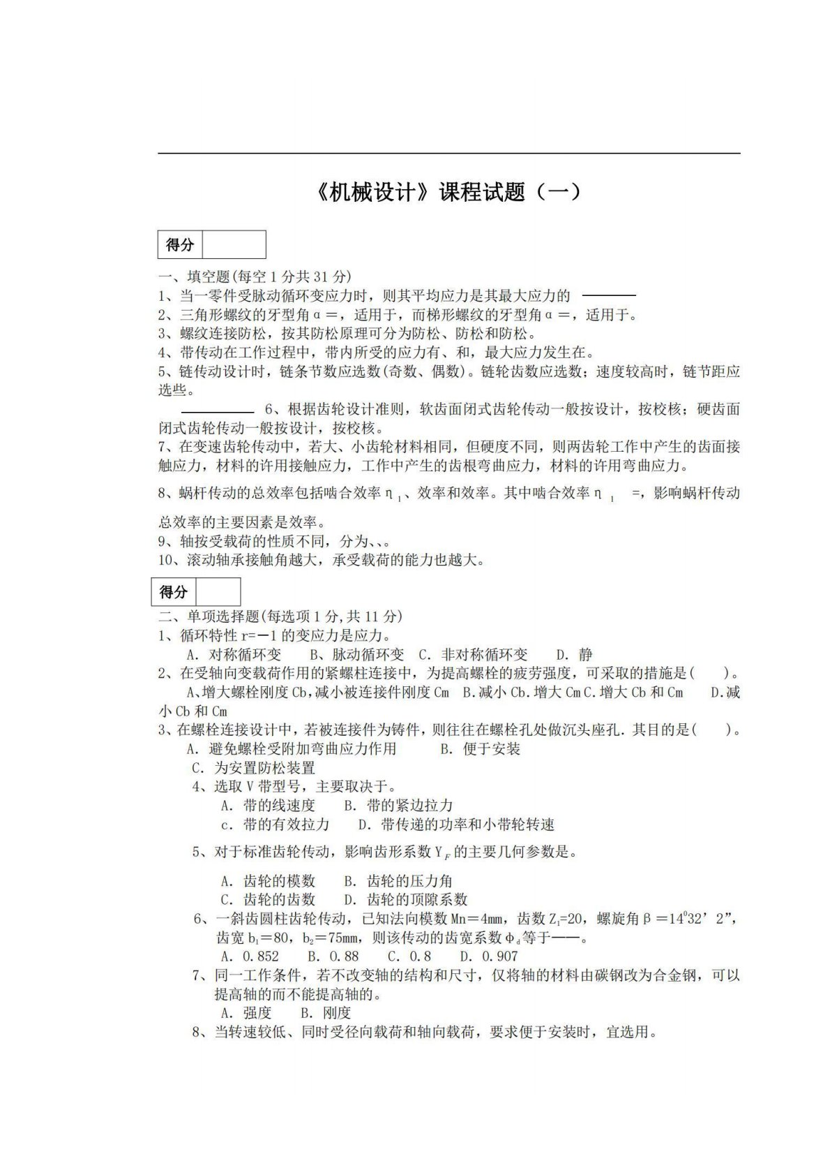 湖南工业大学807机械设计试题一