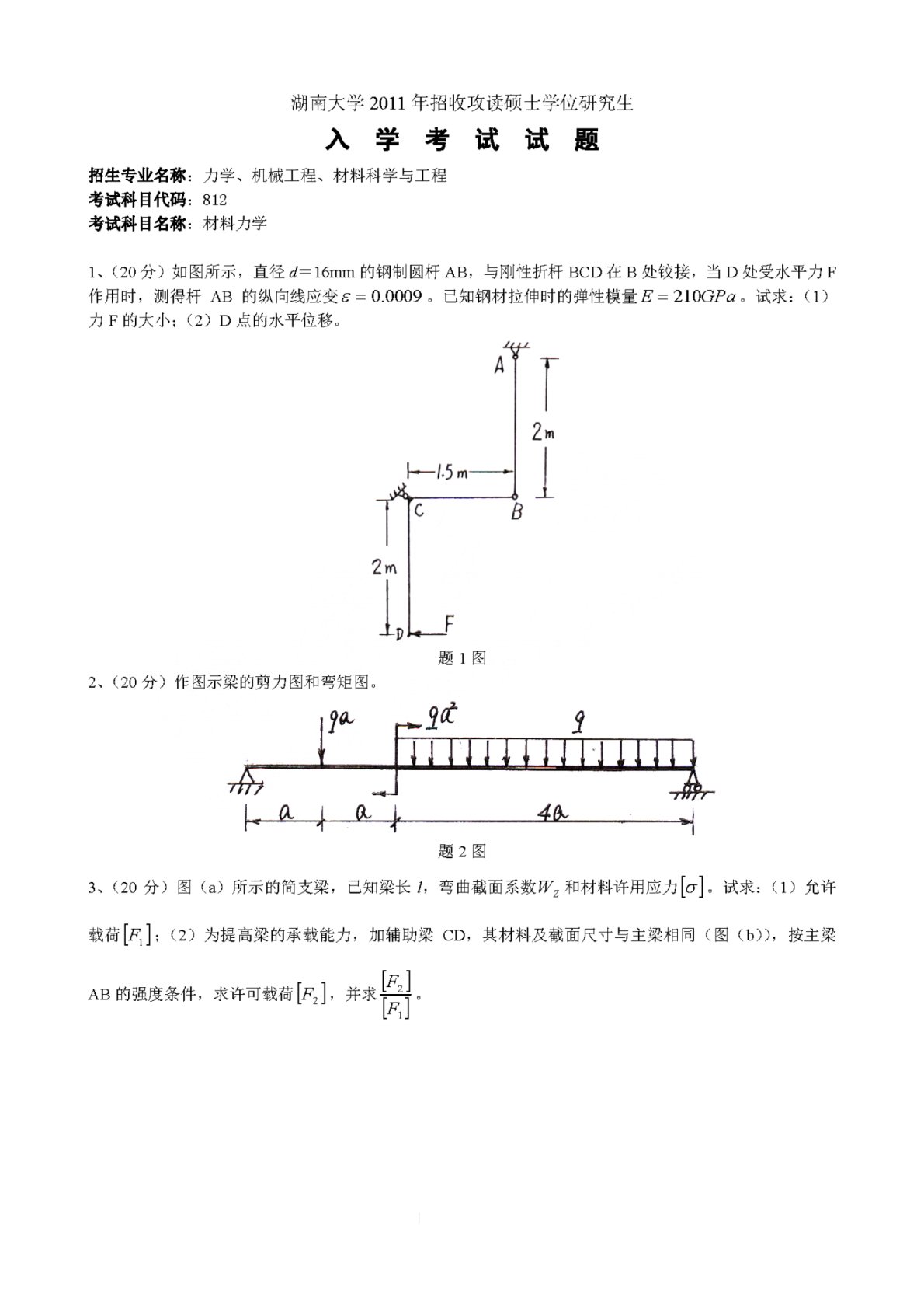 湖南大学2011年812《材料力学》考研真题