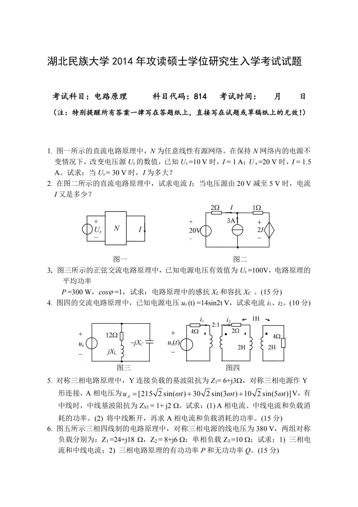 湖北民族大学814电路2014年考研真题