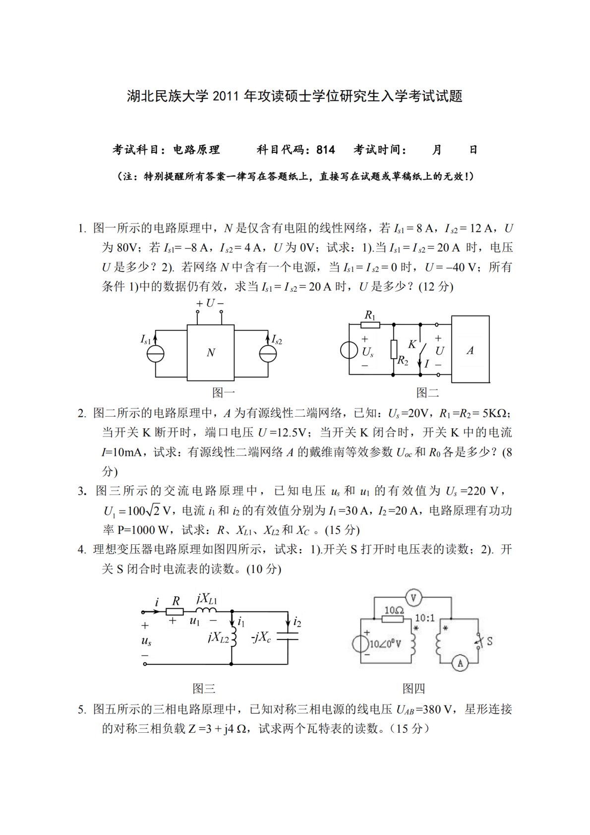 湖北民族大学814电路2011年考研真题