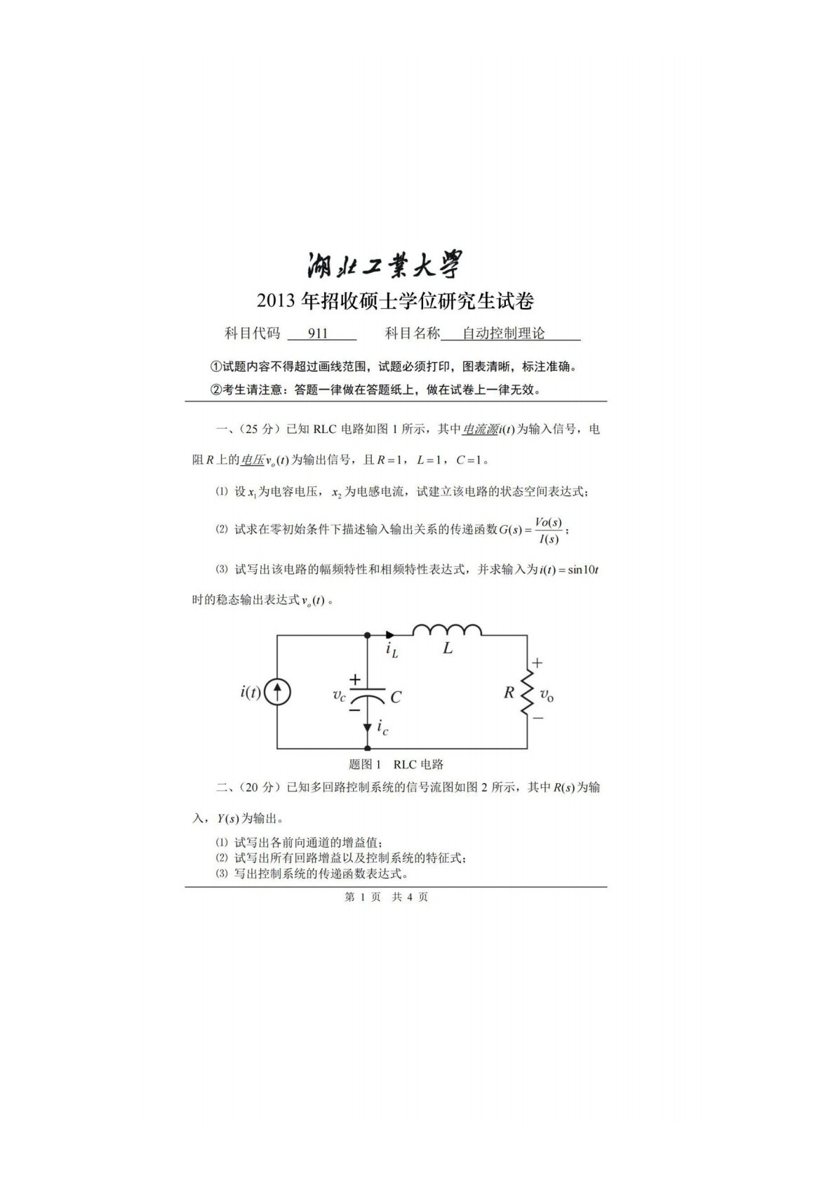湖北工业大学911自动控制理论2013年真题