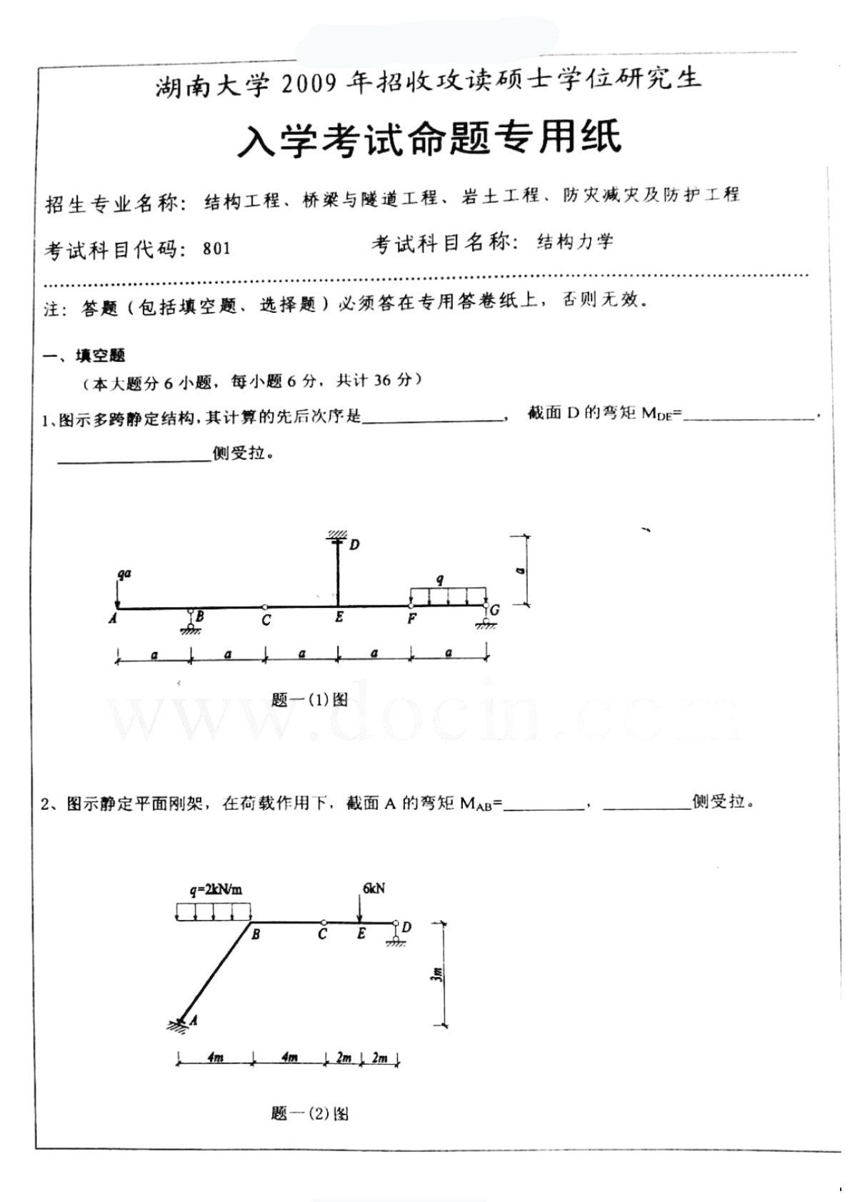湖南大学2009年801结构力学考研真题