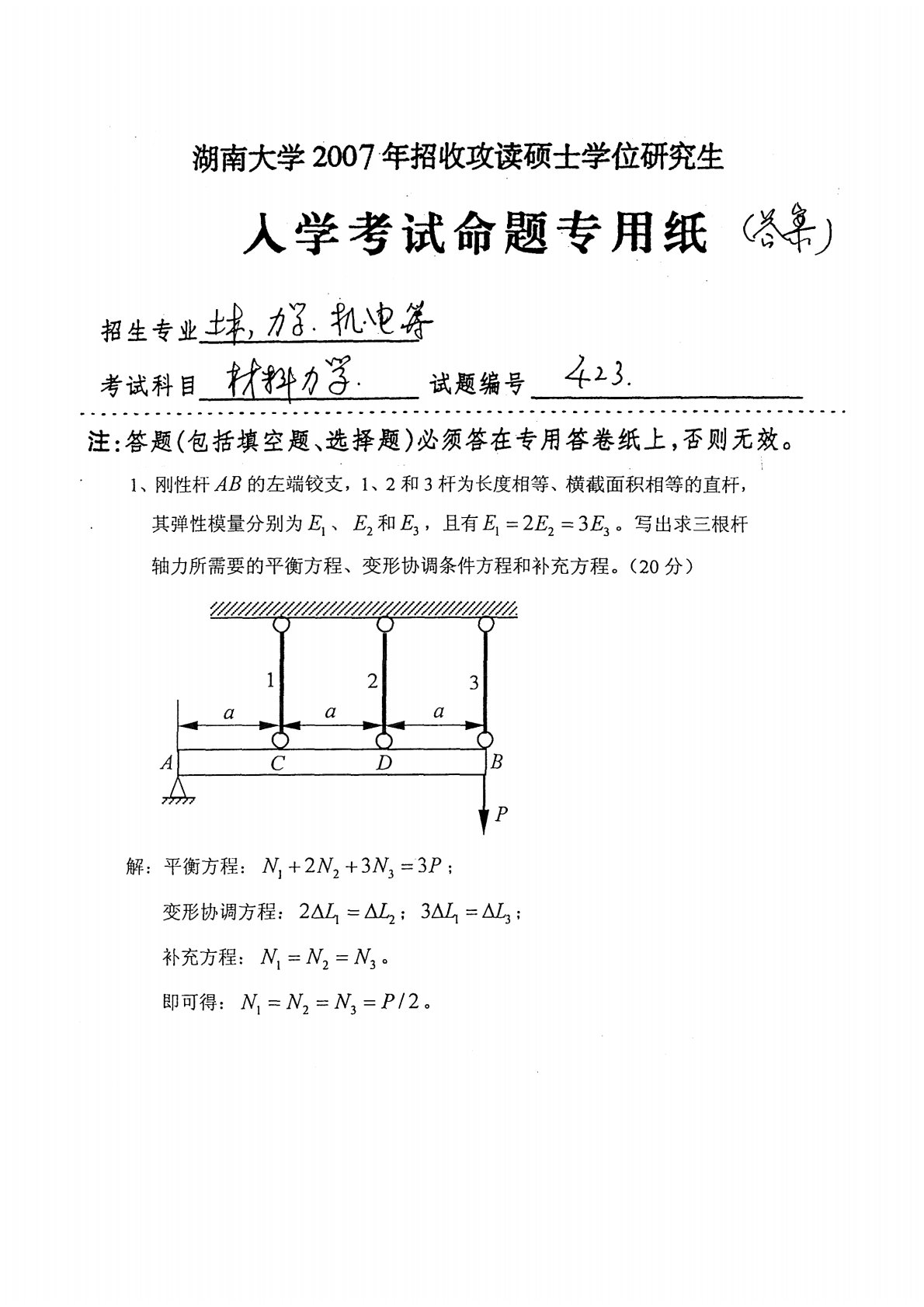湖南大学2007年812《材料力学》考研真题答案