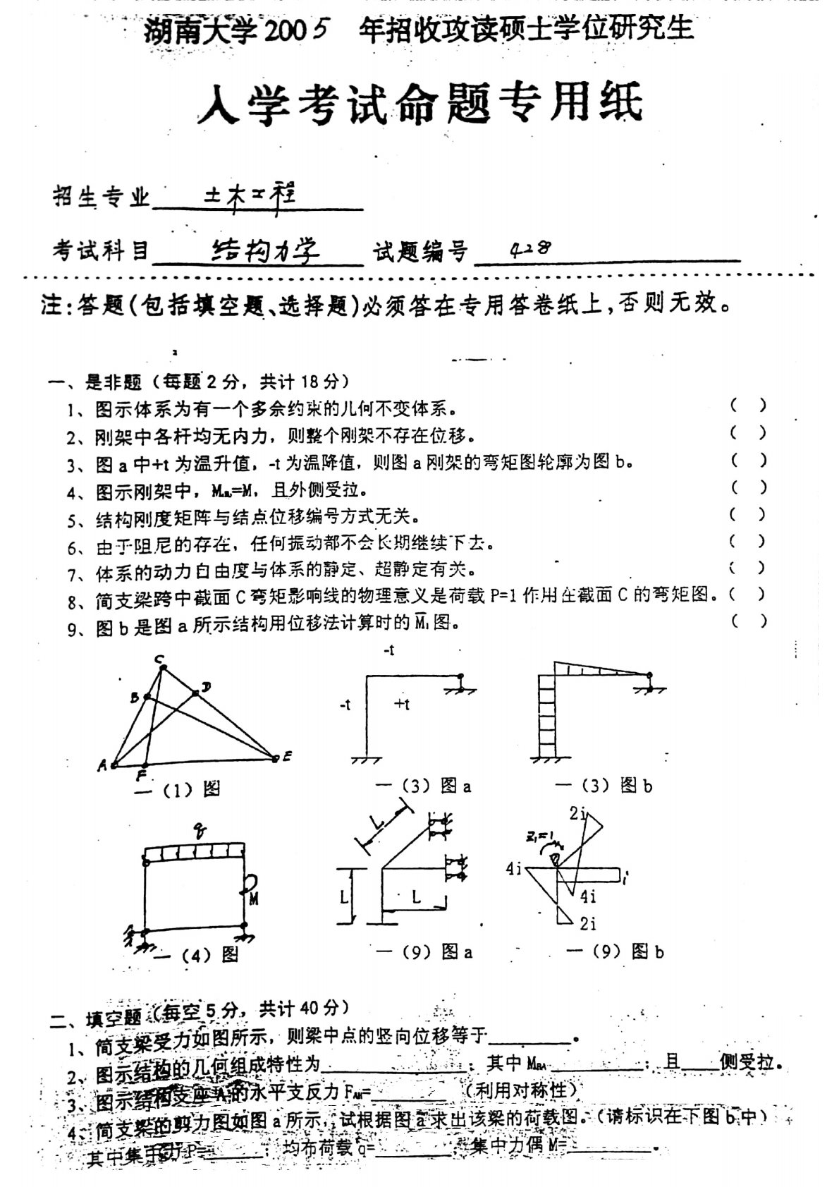 湖南大学2005年801结构力学考研真题