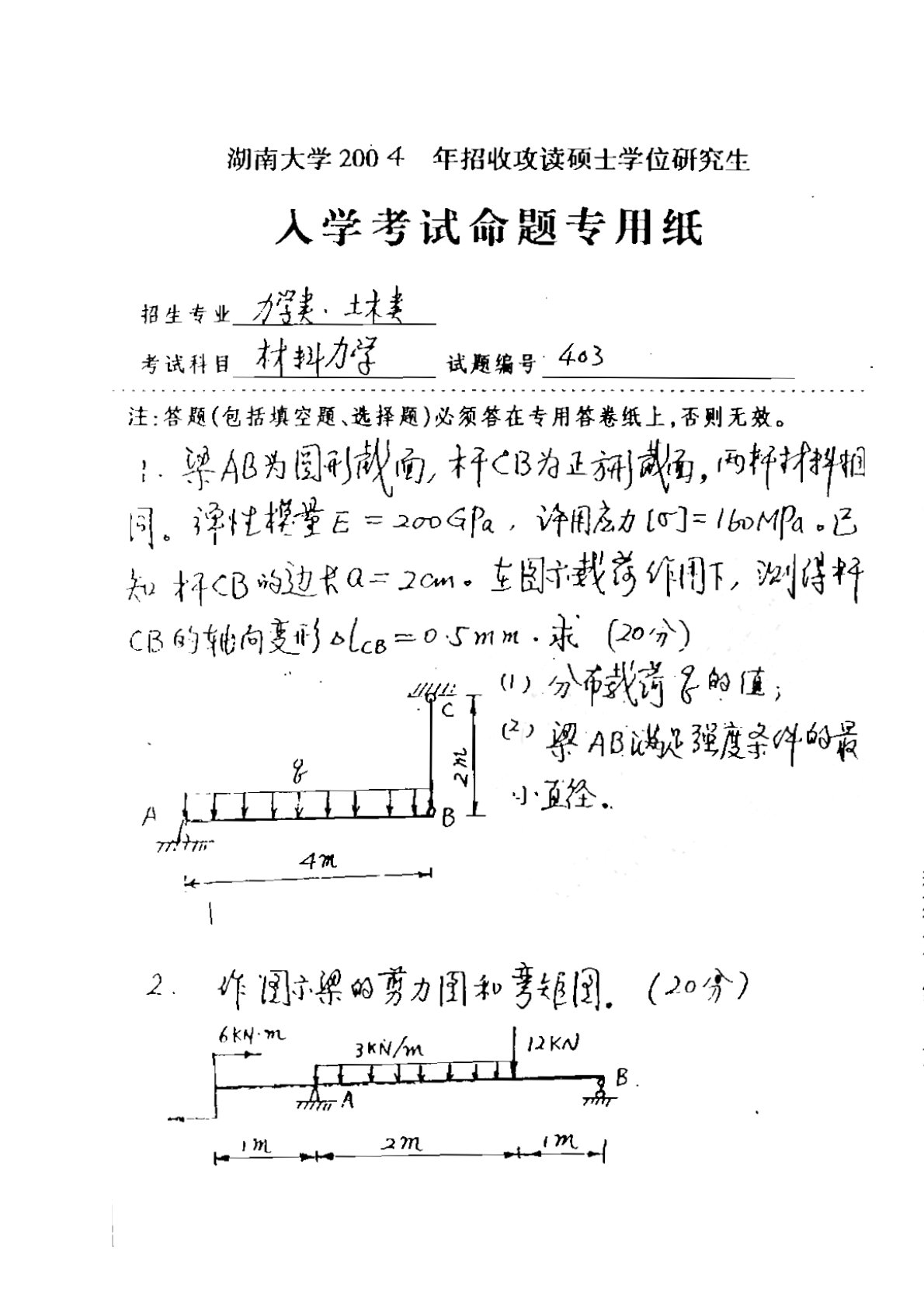 湖南大学2004年812《材料力学》考研真题