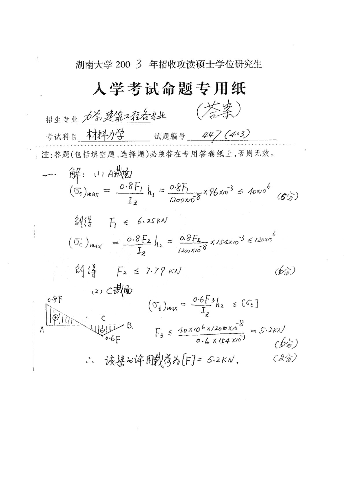 湖南大学2003年812《材料力学》考研真题答案