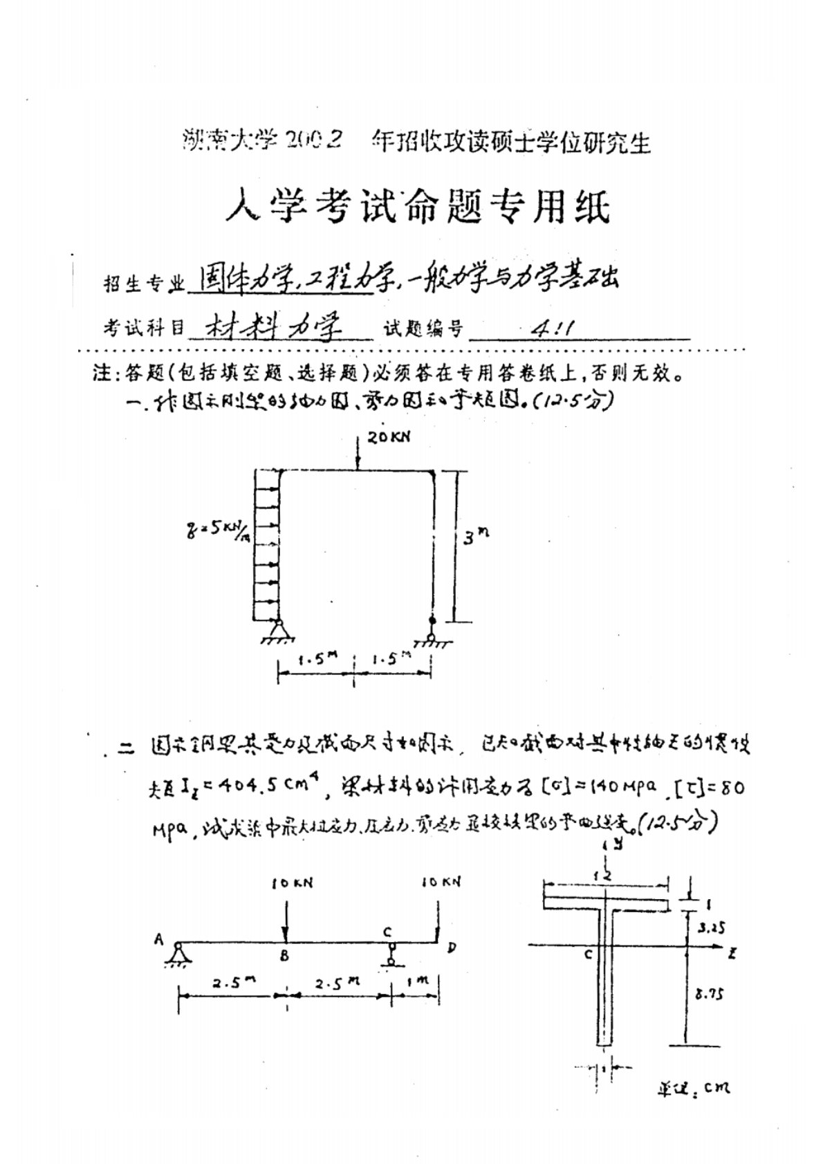 湖南大学2002年812《材料力学》考研真题