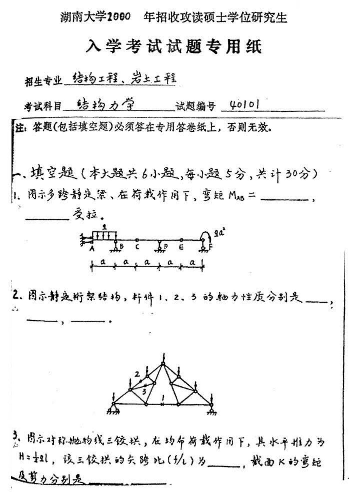 湖南大学2000年801结构力学考研真题