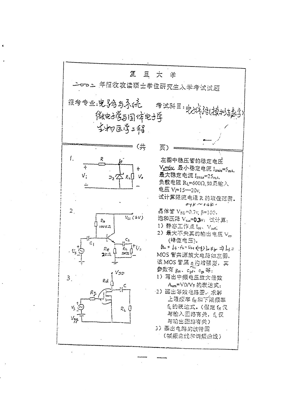 复旦大学881电子线路与集成电路设计2002年真题手写版(电子线路)