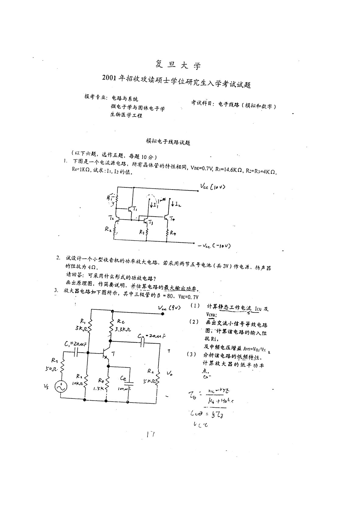 复旦大学881电子线路与集成电路设计2001年真题手写版(电子线路)
