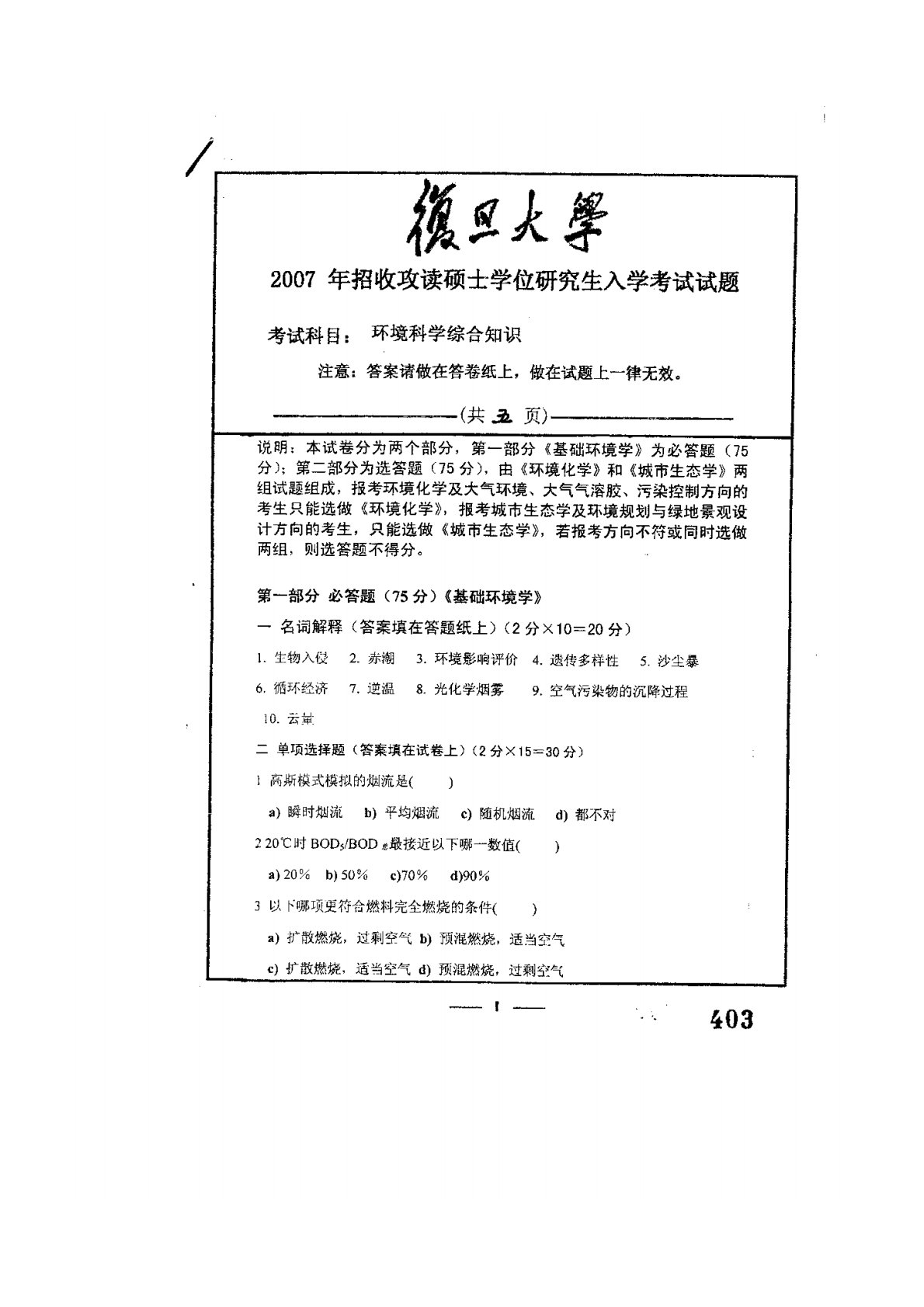复旦大学887环境科学与工程综合知识2007年真题