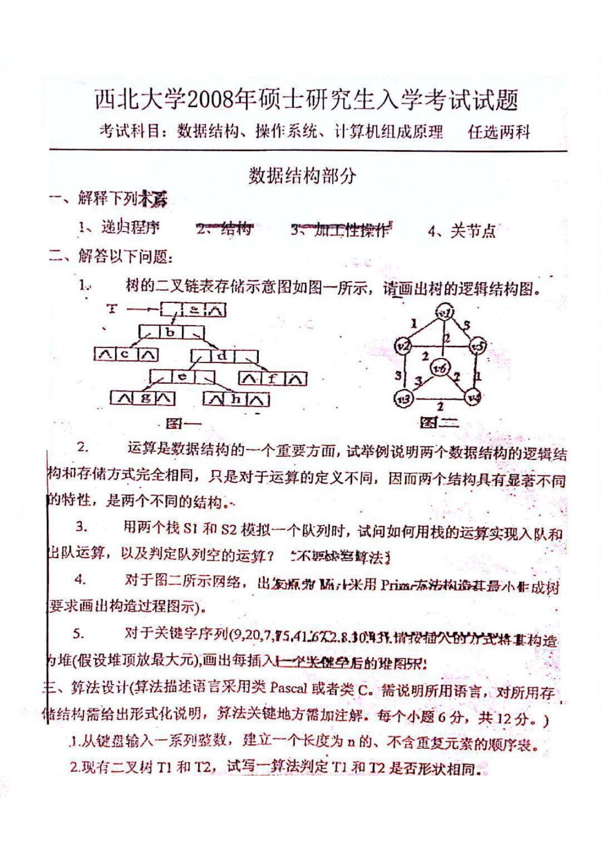 西北大学844计算机类专业基础综合2008年真题
