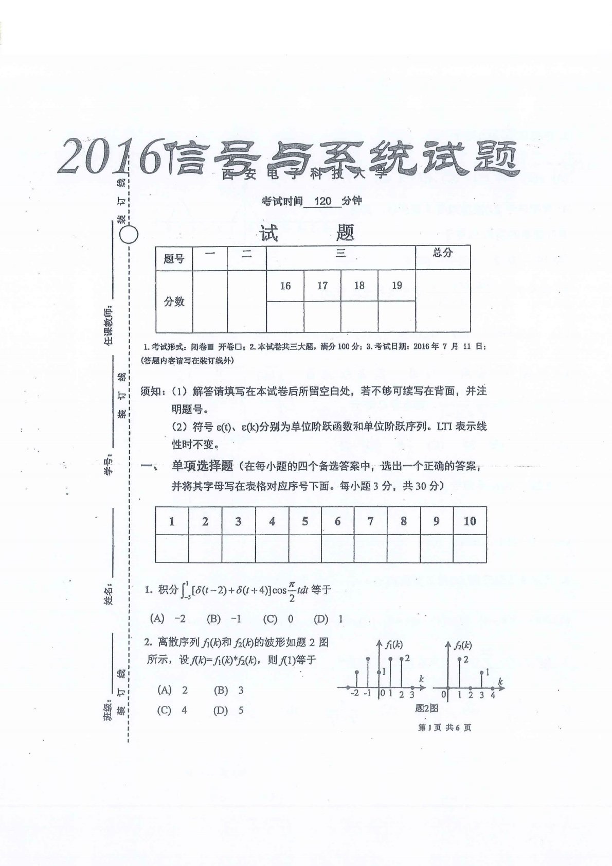 西安电子科技大学844信号与系统2016年期末题