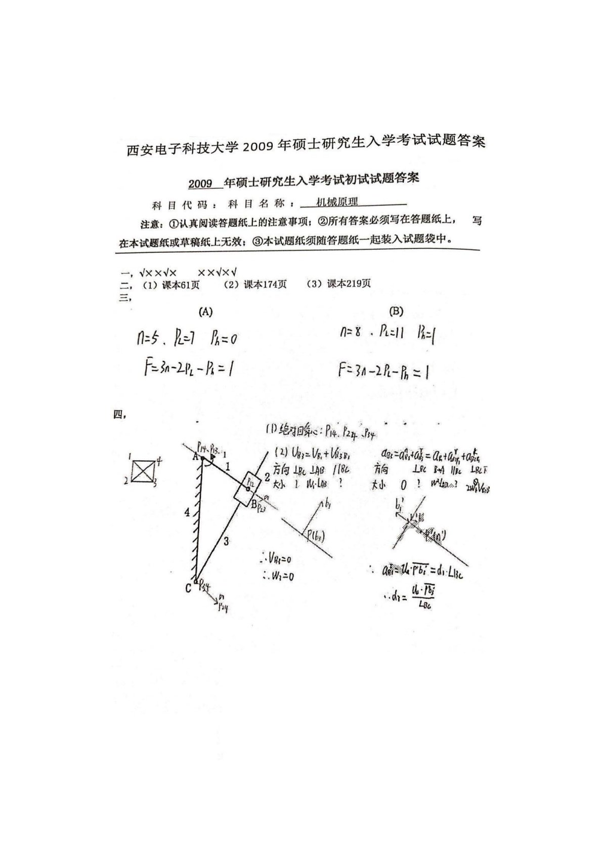 西安电子科技大学841机械原理2009年真题答案手写版