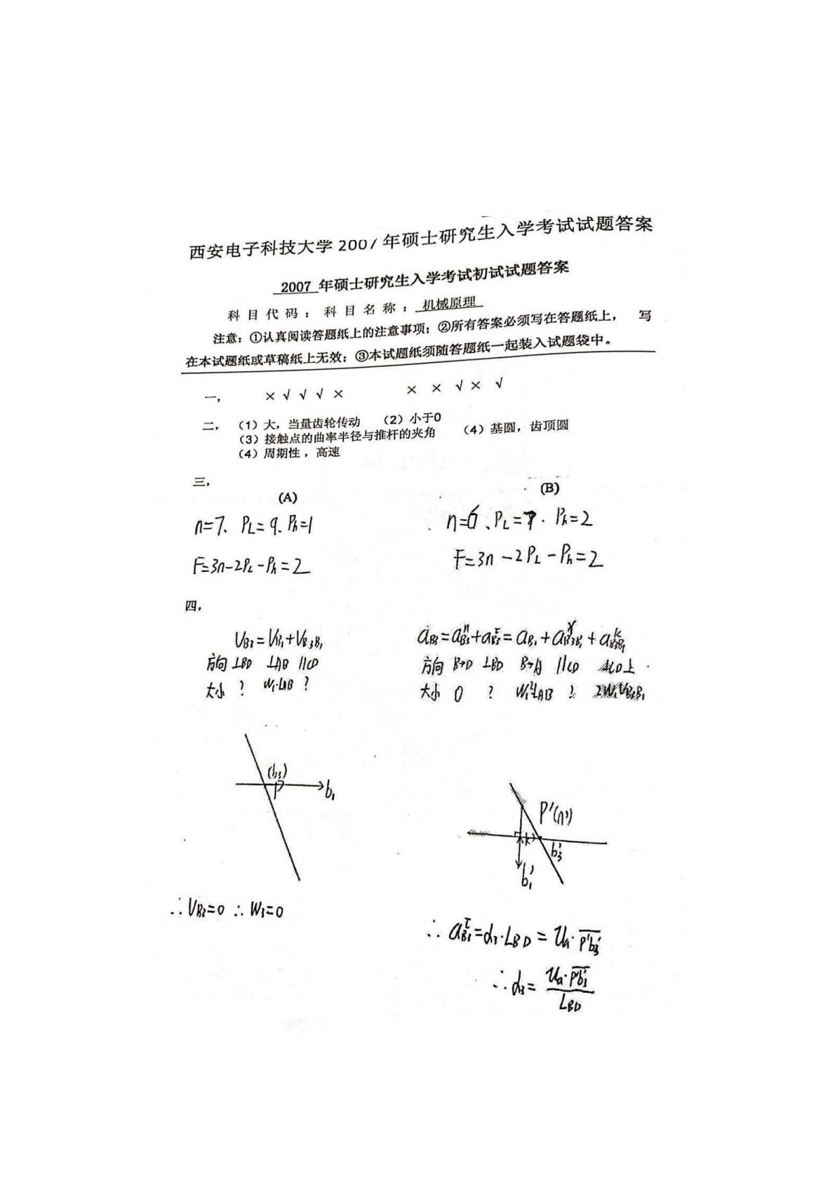 西安电子科技大学841机械原理2007年真题答案手写版