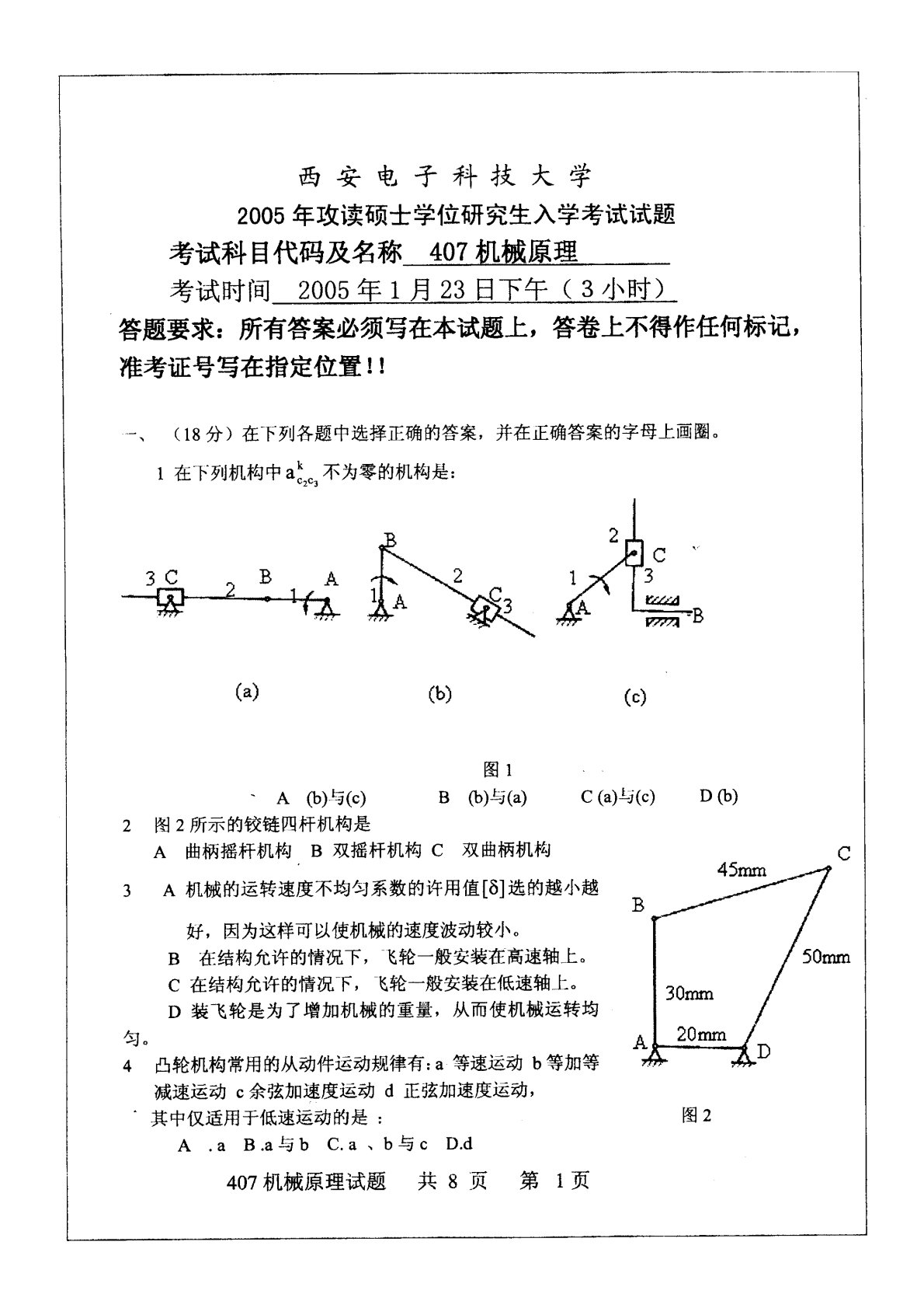 西安电子科技大学841机械原理2005年真题