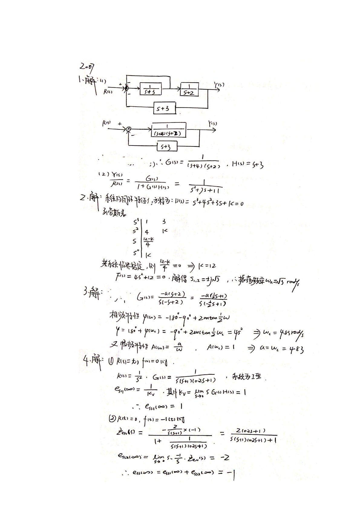 武汉理工大学848自动控制原理2007年真题答案手写版