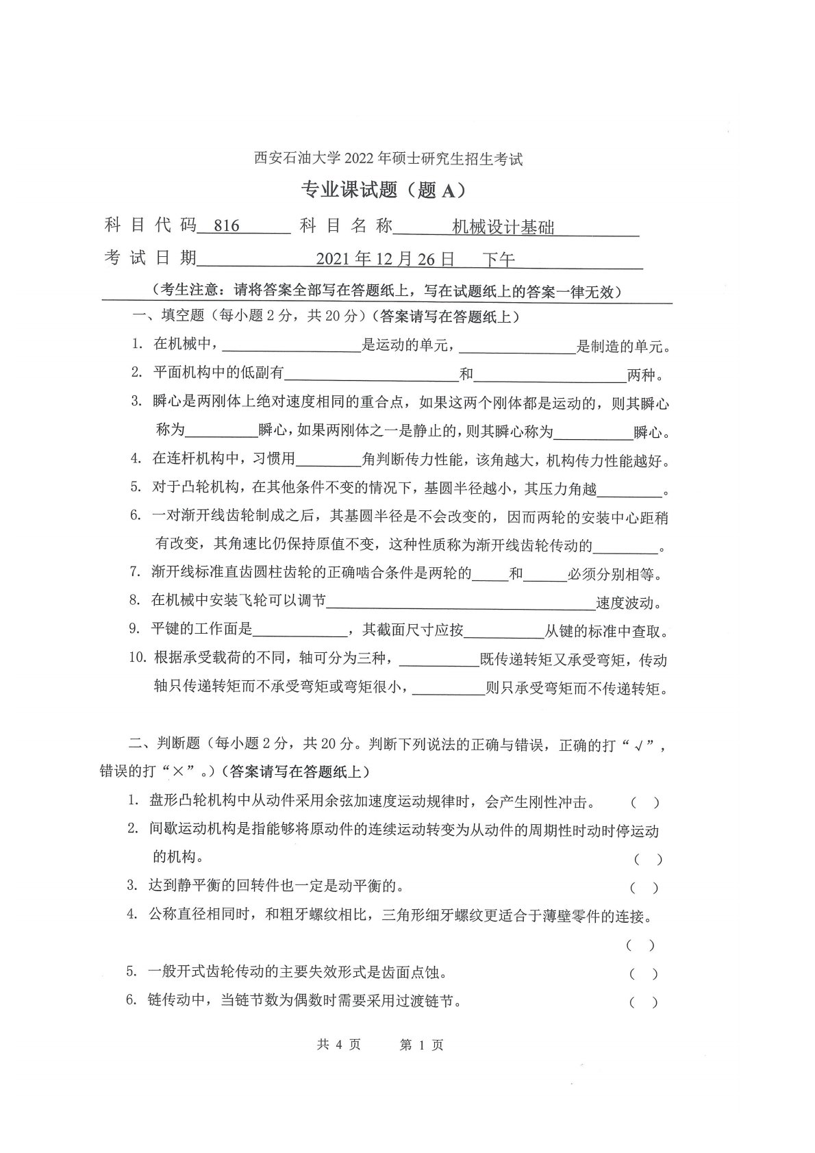 西安石油大学816机械设计基础2022年真题
