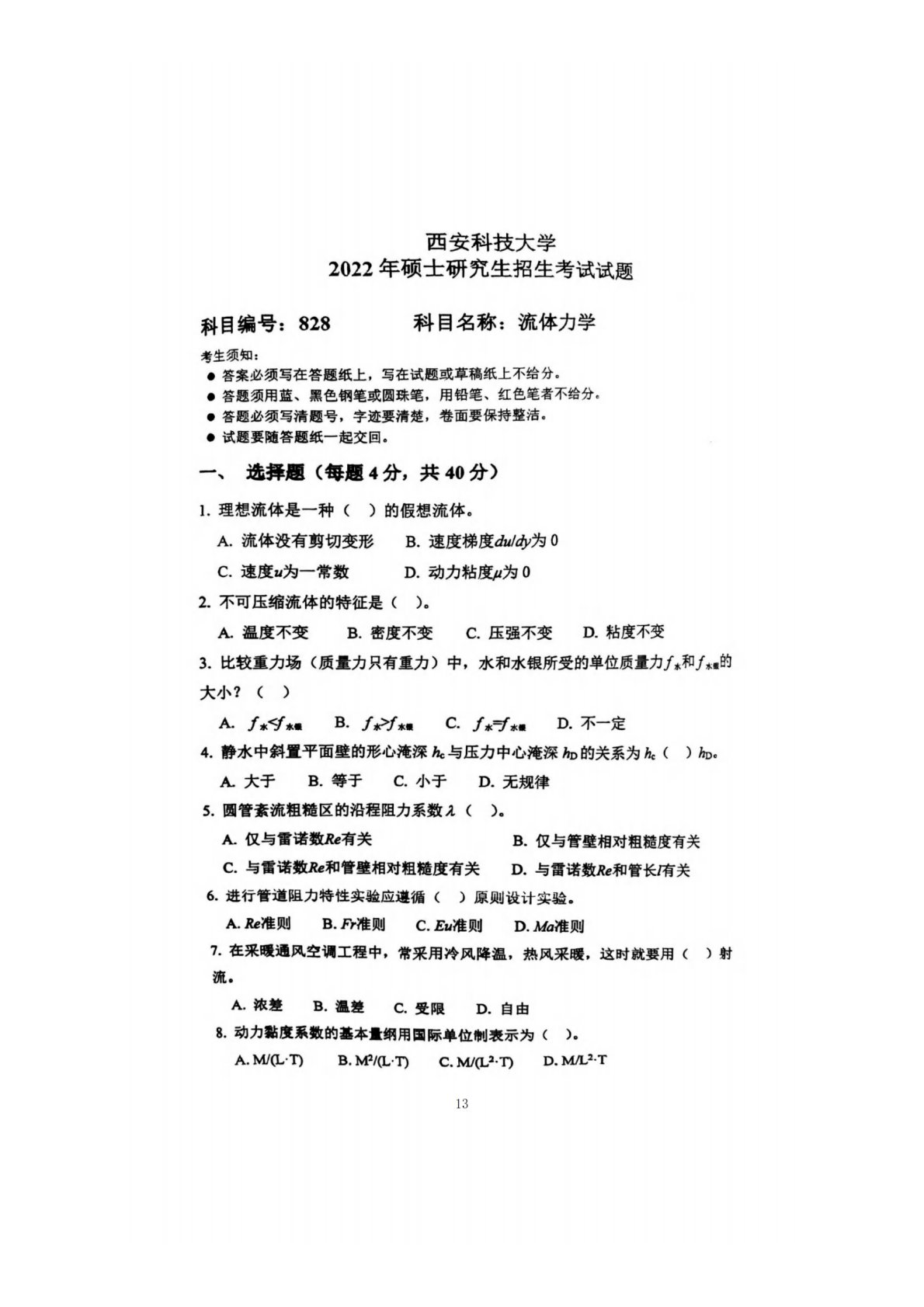 西安科技大学828流体力学2022年真题