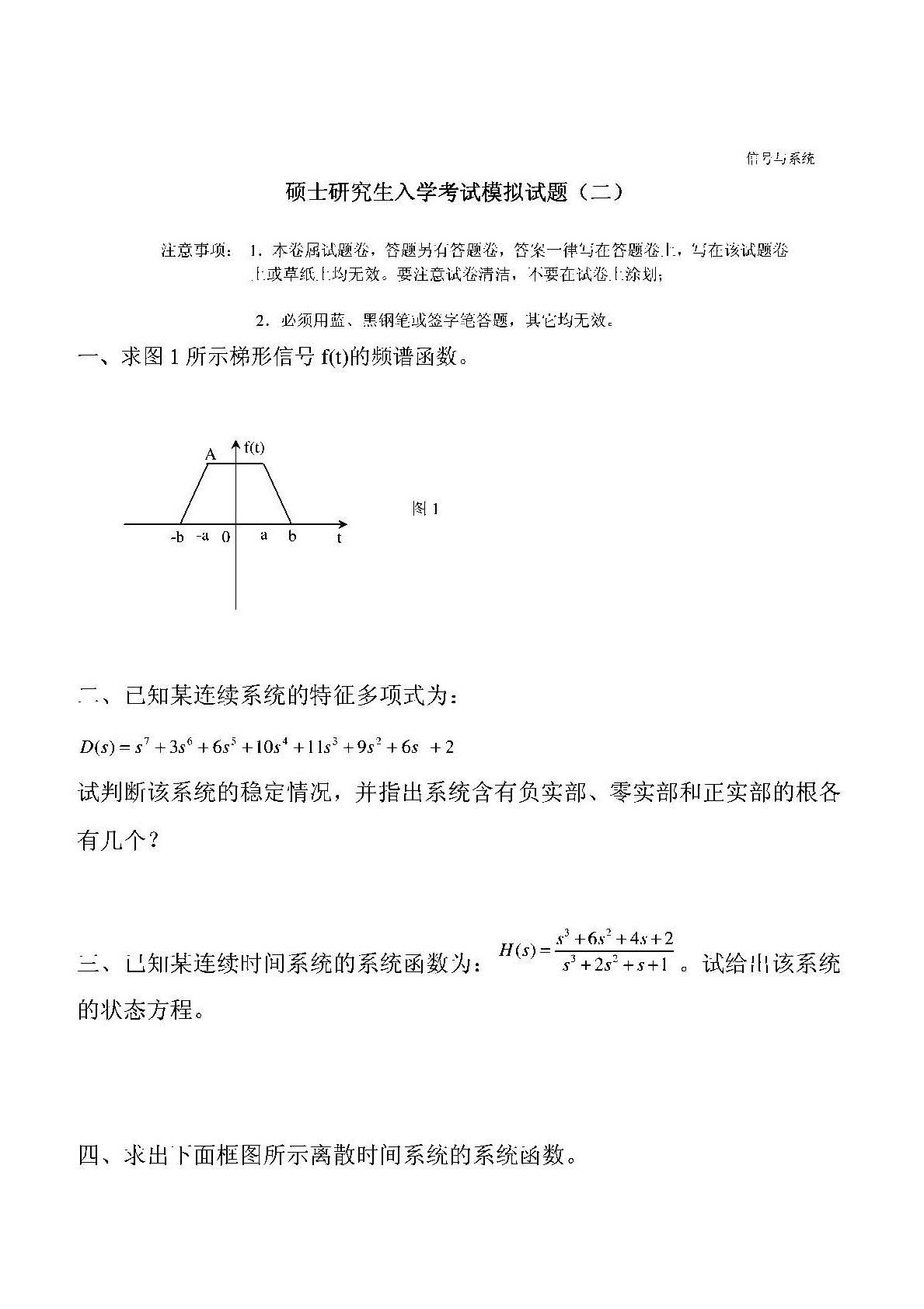 西安电子科技大学844信号与系统模拟试题二