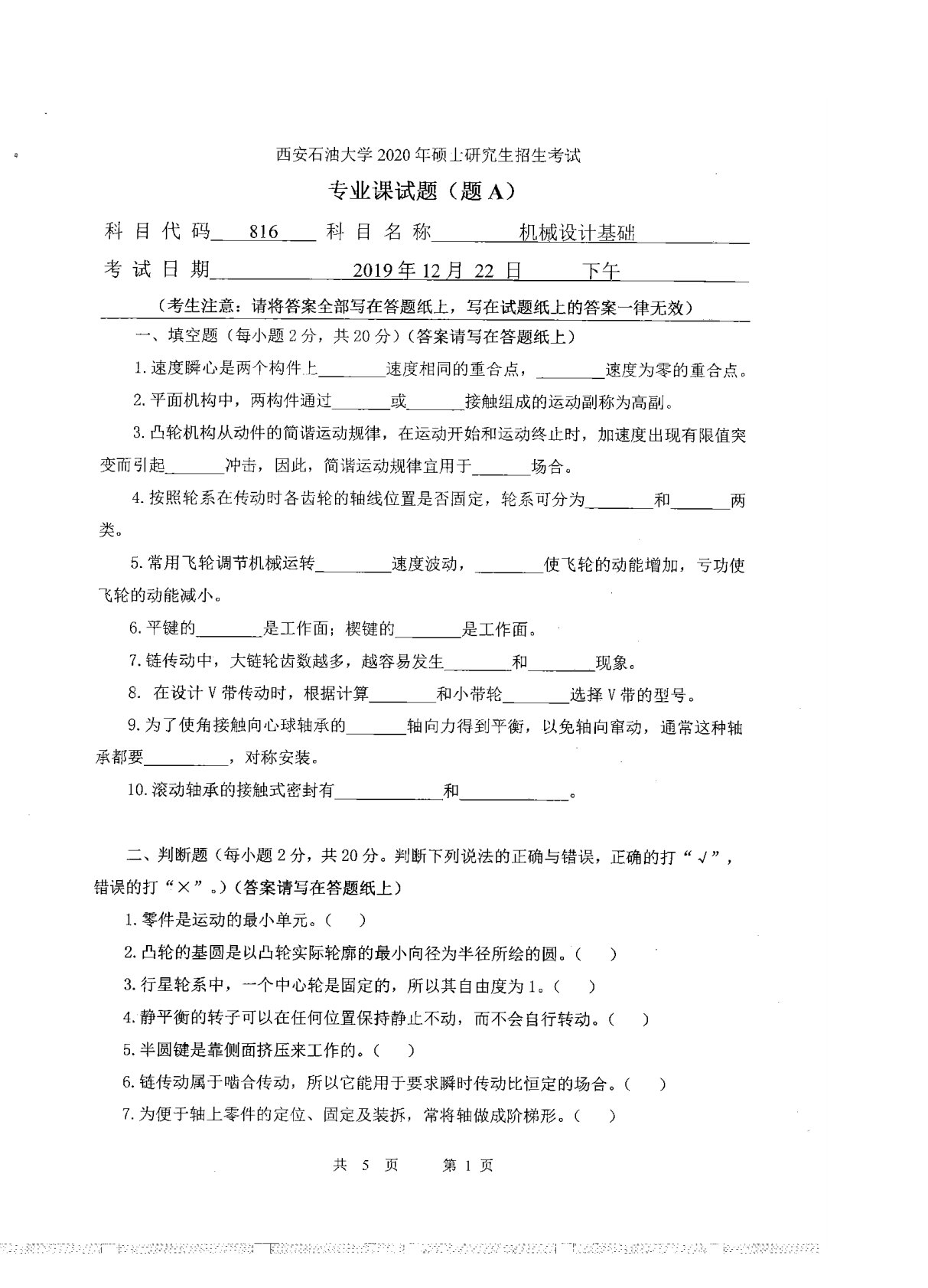 西安石油大学816机械设计基础2020年真题