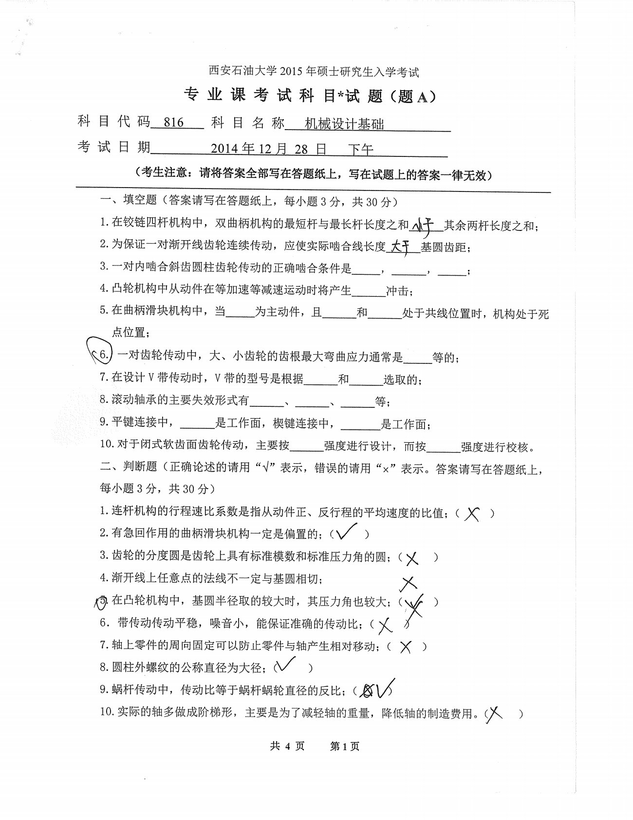 西安石油大学816机械设计基础2015年真题