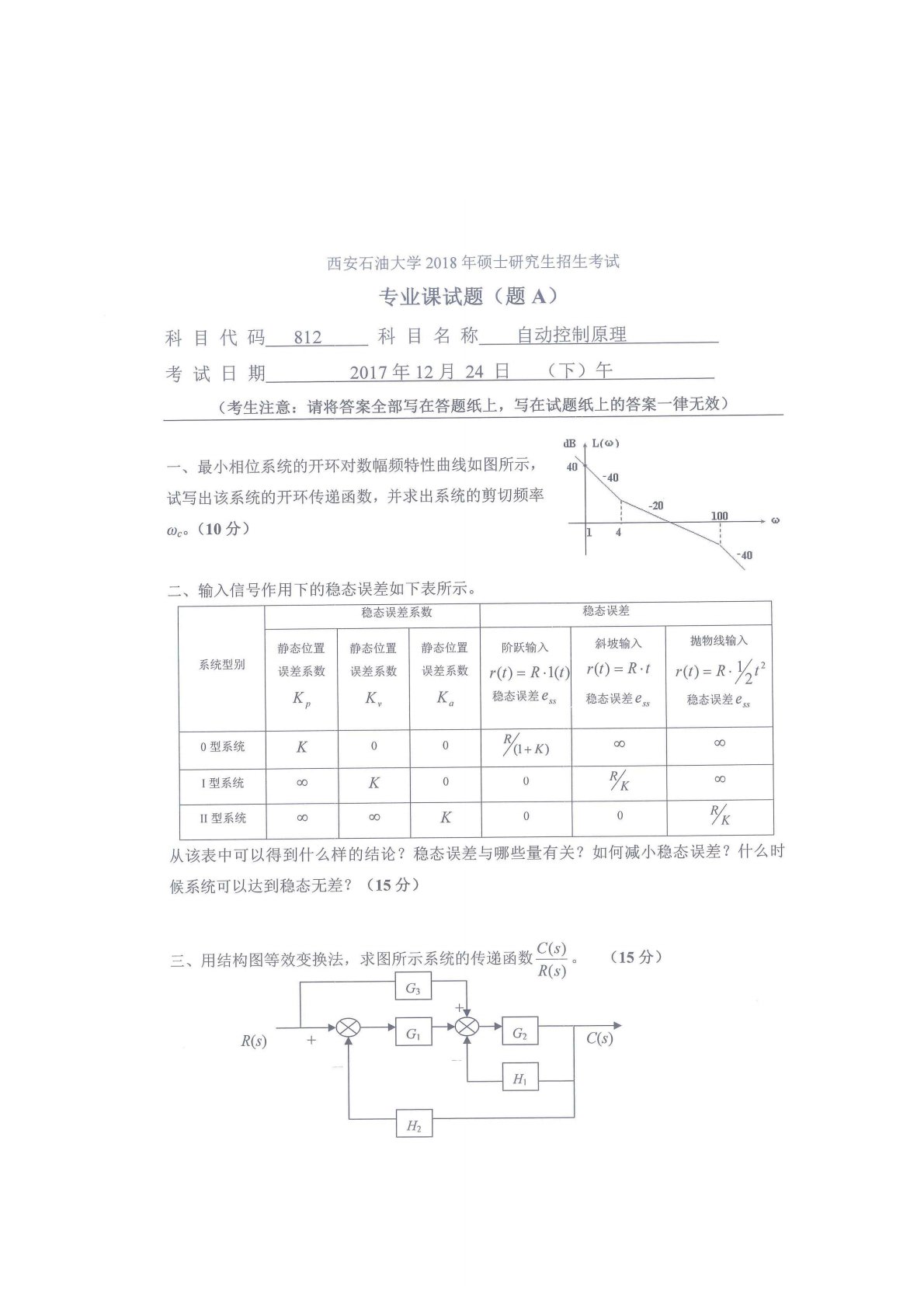 西安石油大学812自动控制原理2018年真题