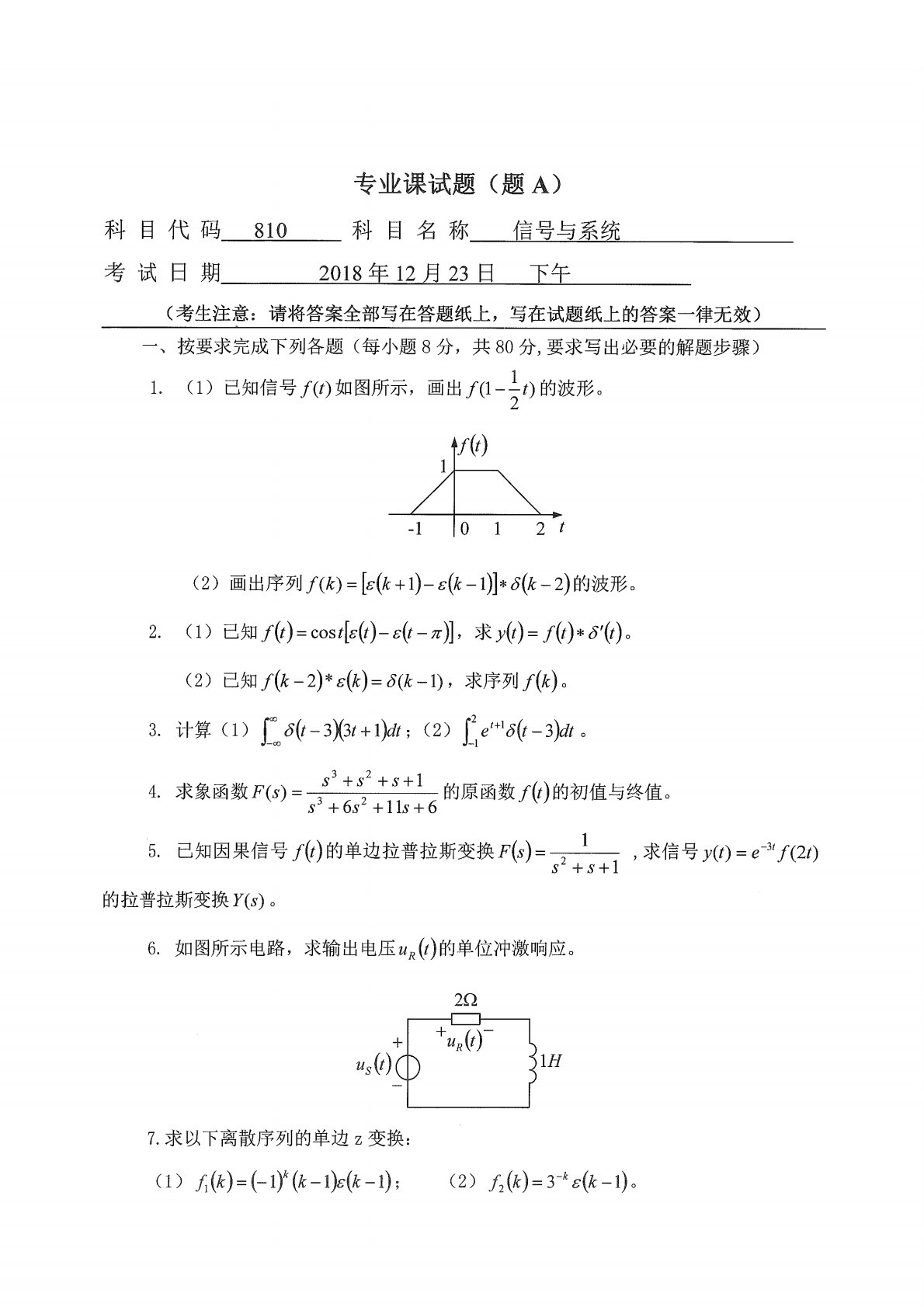西安石油大学810信号与系统2019年真题