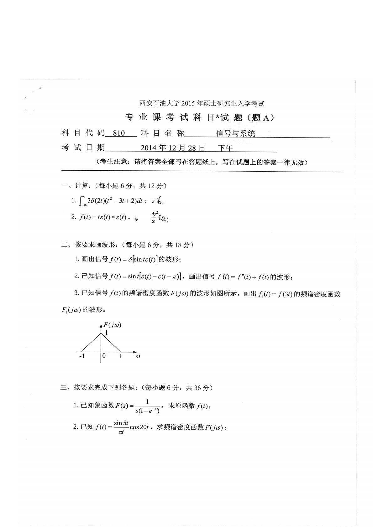 西安石油大学810信号与系统2015年真题