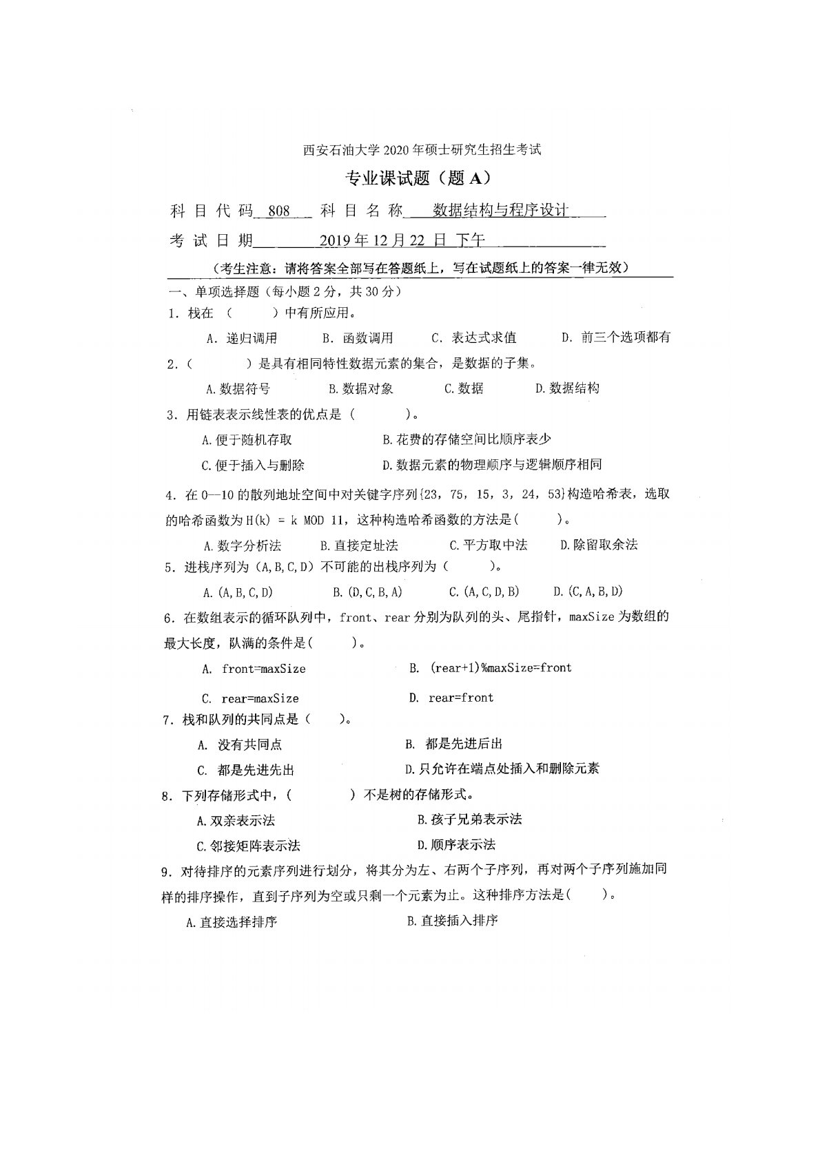 西安石油大学808数据结构与程序设计2020年考试真题