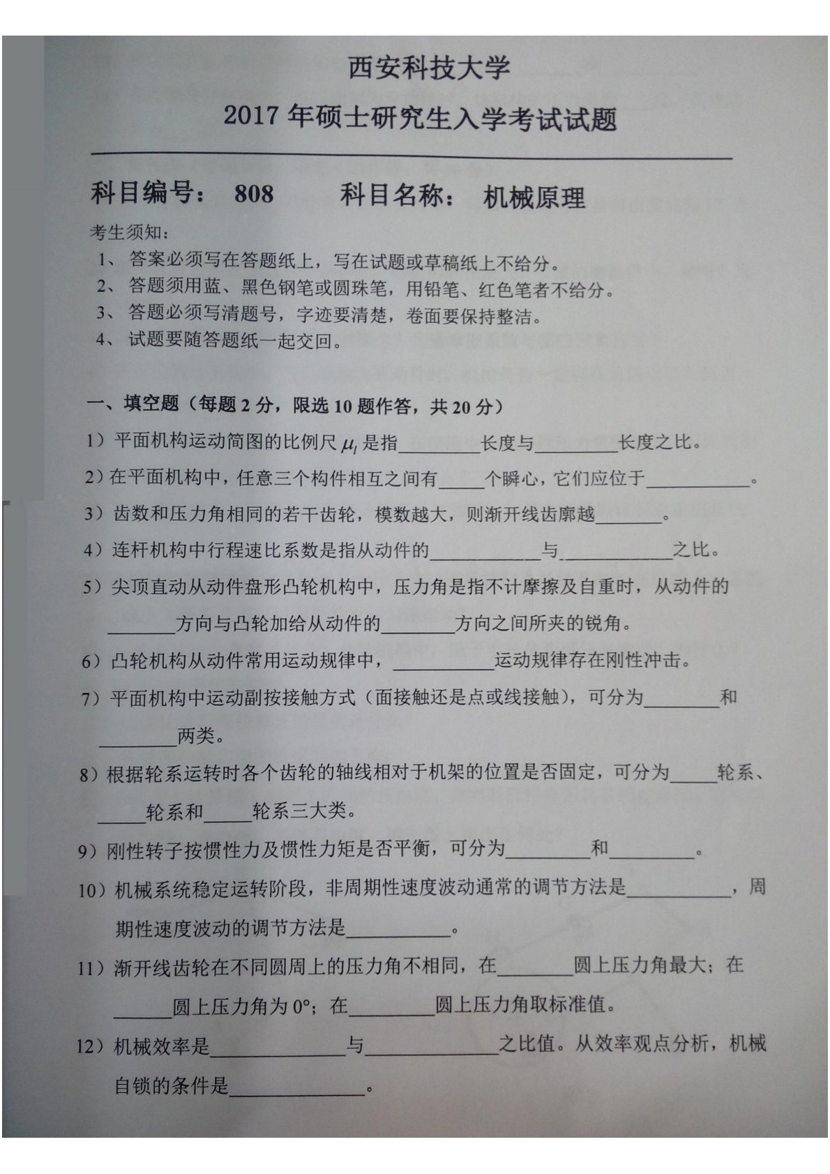 西安科技大学809机械设计基础2017年考研真题